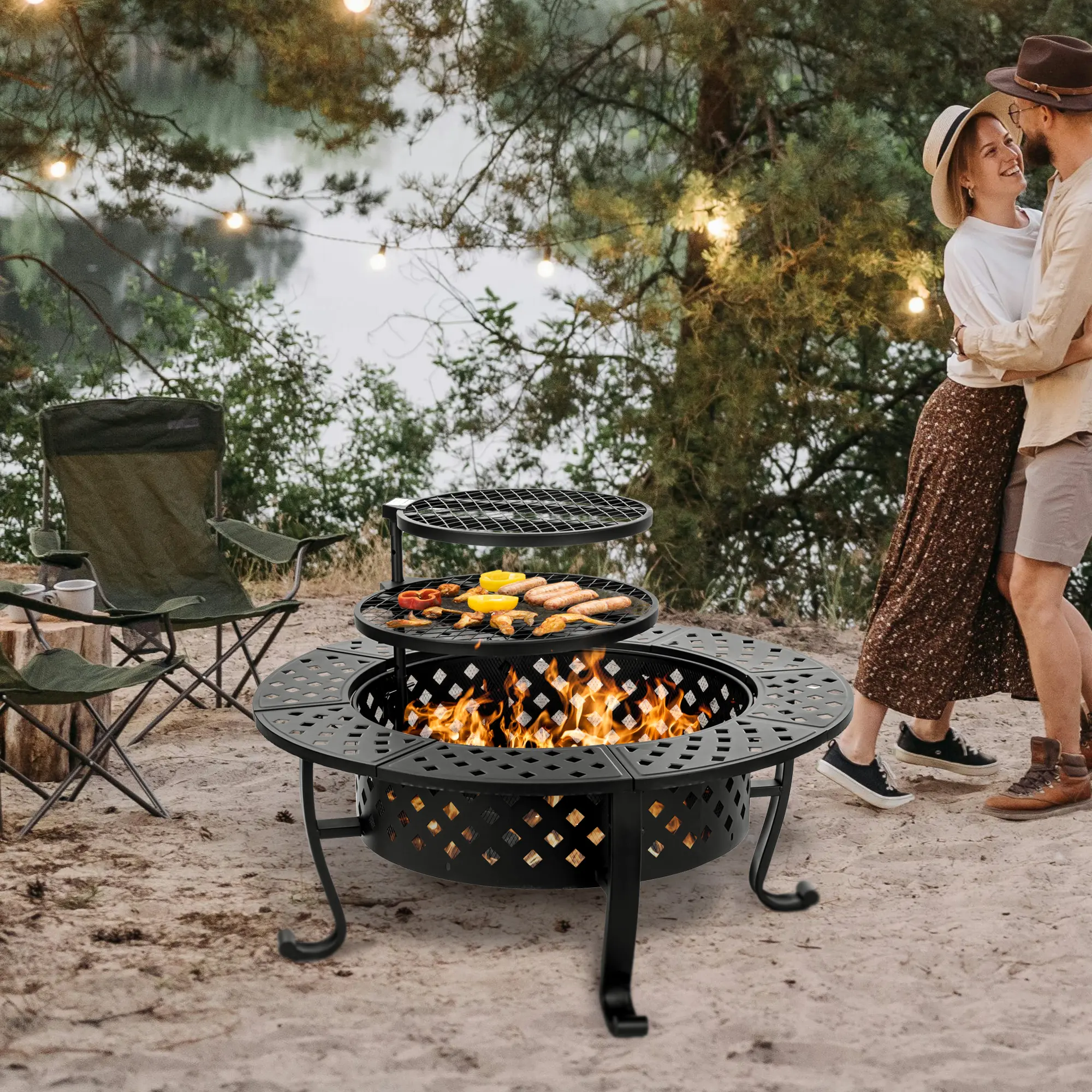 【Adjustable Grilling Grates】Equipped with 2 height-adjustable, 360° rotating cooking grills, this fire pit allows for versatile food preparation and heat control. Enjoy toasting food or keeping it warm with ease, ensuring delicious results every time.