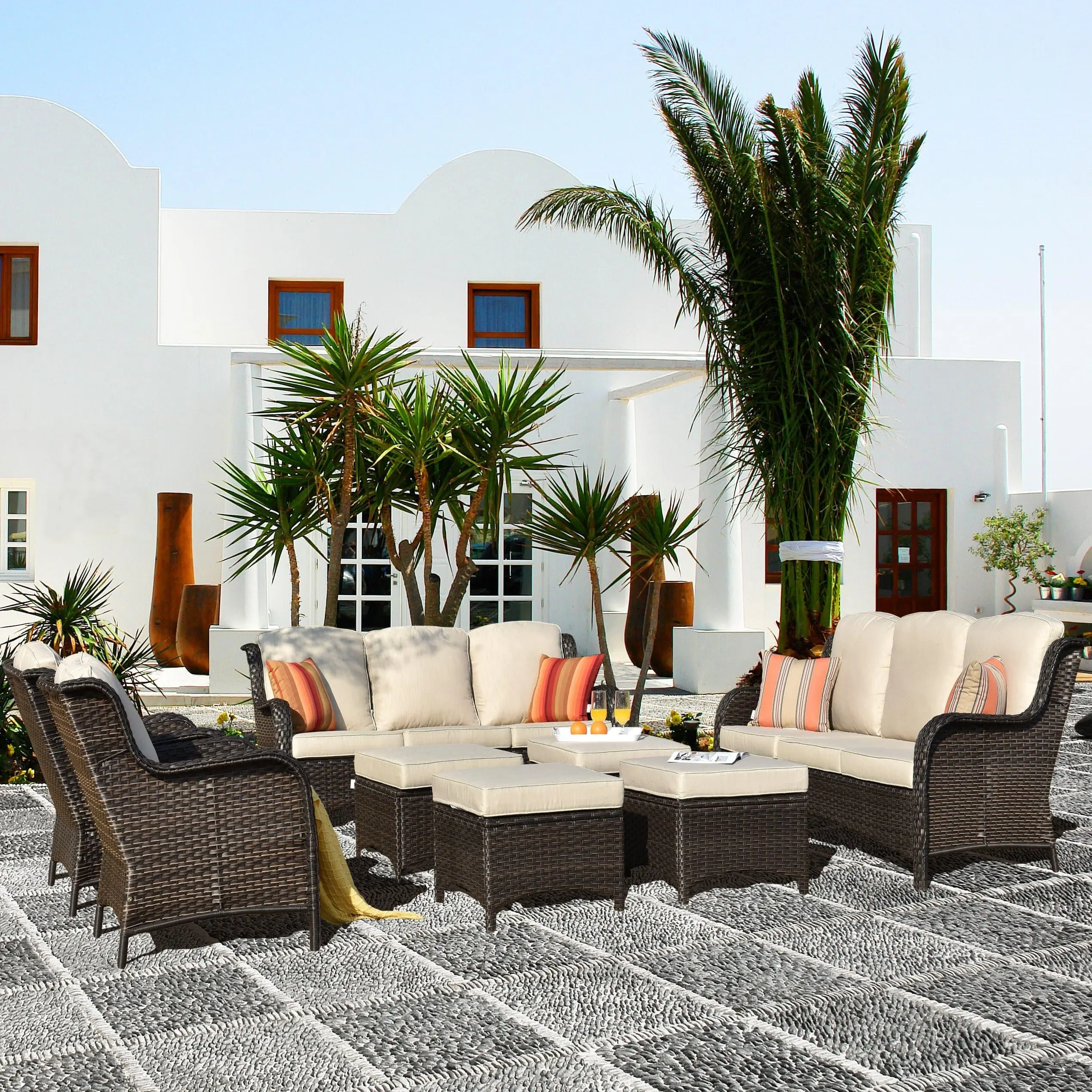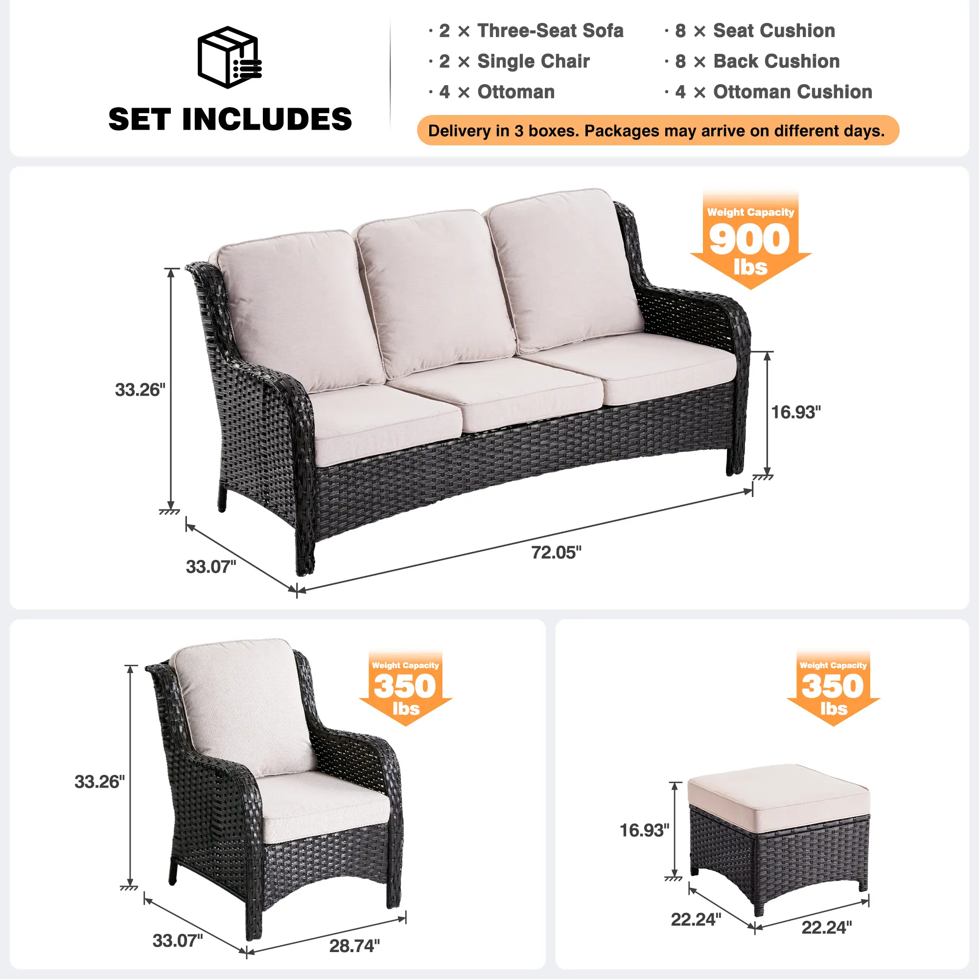Seating Capacity 8 Weight capacity Chair 250 LBS, Couch 660 LBS Seating Inner Frame Material Steel Frame Seating Outer Frame Material PE Wicker Wicker Durability Water Resistant; UV Resistant Cushions Included 16 Unit Cushion Durability Water Resistant; UV Resistant Cushion Thickness 3.54" Cushion Attachment Type No Direct Attachment Method Removable Cushion Cover Yes Cushion Cover Closure Method Zipper Cushion Fill Material Foam/Cotton Cushion Cover Material Fabric