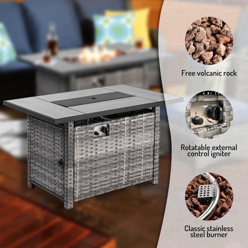 Grill Tank Not included Desktop material Porcelain Burning Area Material Stainless Steel Exterior Material PE Wicker & Powder-coated Steel Finish Metal Steel Fuel Type Propane Burn Time of Fuel Accommodated 6 hours Ignition Type Electronic ignition, Control knob Adjustable Flame Yes BTU Output 50,000 BTU Filler Accommodated Lava rocks Filler Included Yes Weather Resistant Yes Cover Included Yes Product Care Do not pressure wash Location Outdoor Use Only Hidden Fuel Tank Yes Product Shape Square Gas Tank Size Accommodated 20 lbs.
