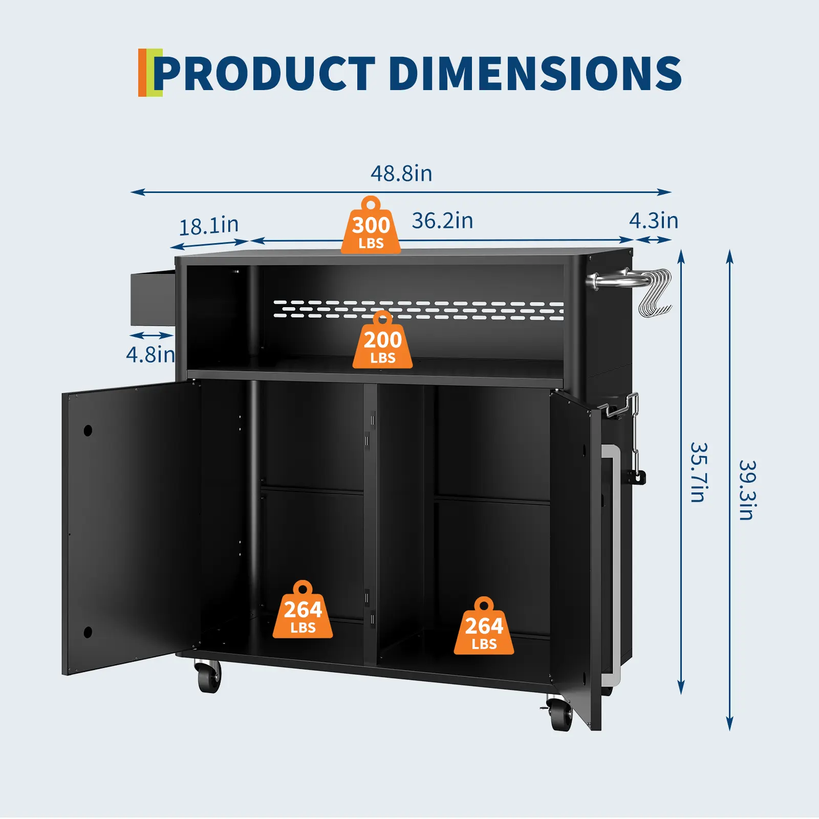 ·1.Outdoor Dining Cart: Our big storage cabinet outdoor grill cart is made of durable stainless steel. Perfect for placing a pizza oven and accessories, portable grill or griddle; There are 883 S.Q. IN. area ample workplace for outdoor cooking, kitchen or serving. The Top shelf weight capacity: 300LBS, middle shelf weight capacity: 200 LBS.