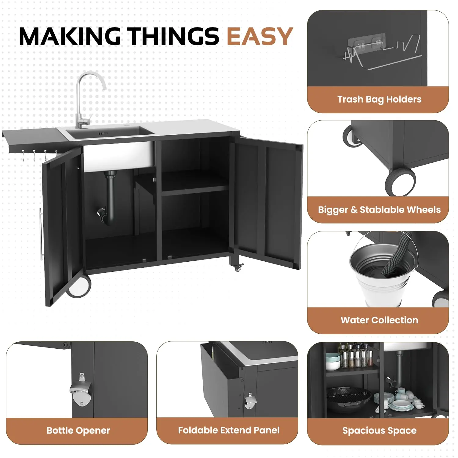 • Smart Multi-Functional Workspace: Equipped with an adjustable workstation (38"-54") and prep surfaces. A 7.7" deep sink with debris filter pairs with 60+ gallon storage, 4 hooks, and a trash bag holder. Ideal for BBQ organization. 🍕