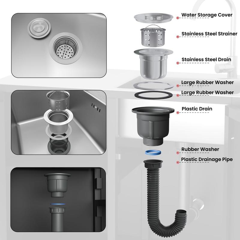 • Professional-Grade Drainage System: Quick-connect drainage with arc-shaped PVC pipes and dual filtration ensures fast water evacuation. The 7.7" deep basin with overflow protection and angled drainboard is perfect for washing produce. 🌿