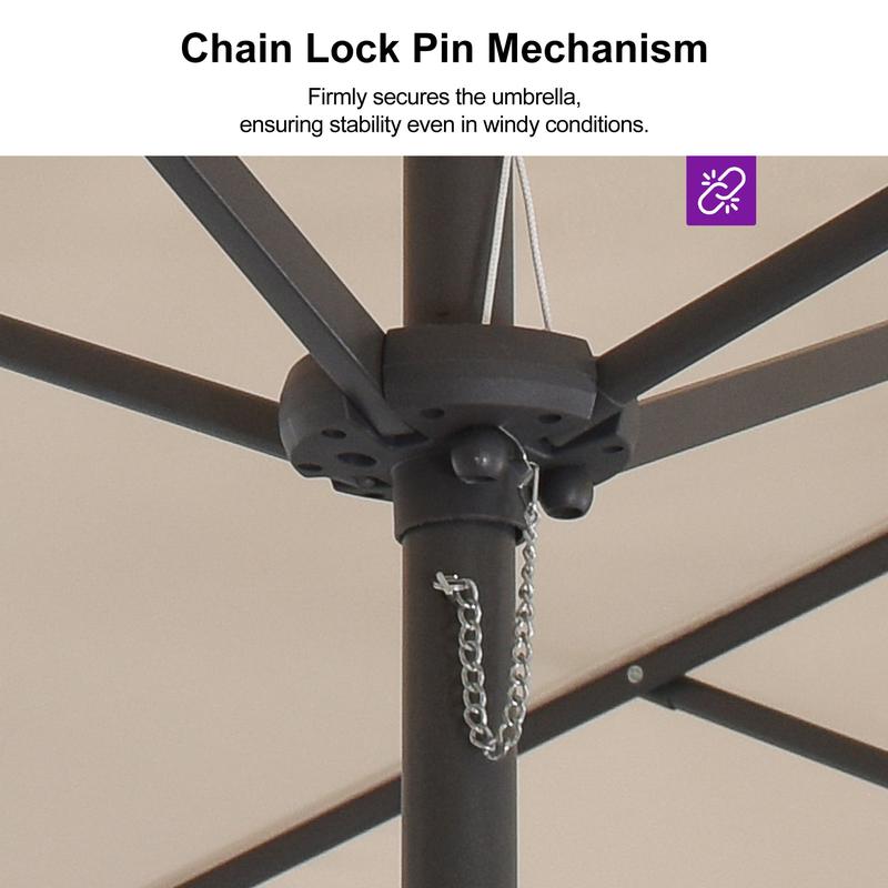 [ Crank Design ] The simple crank lifting system is equipped, enabling the convenient and rapid opening and closing of the patio umbrella. Additionally, an advanced chain lock pin is provided, ensuring the stability of the umbrella even in windy conditions.