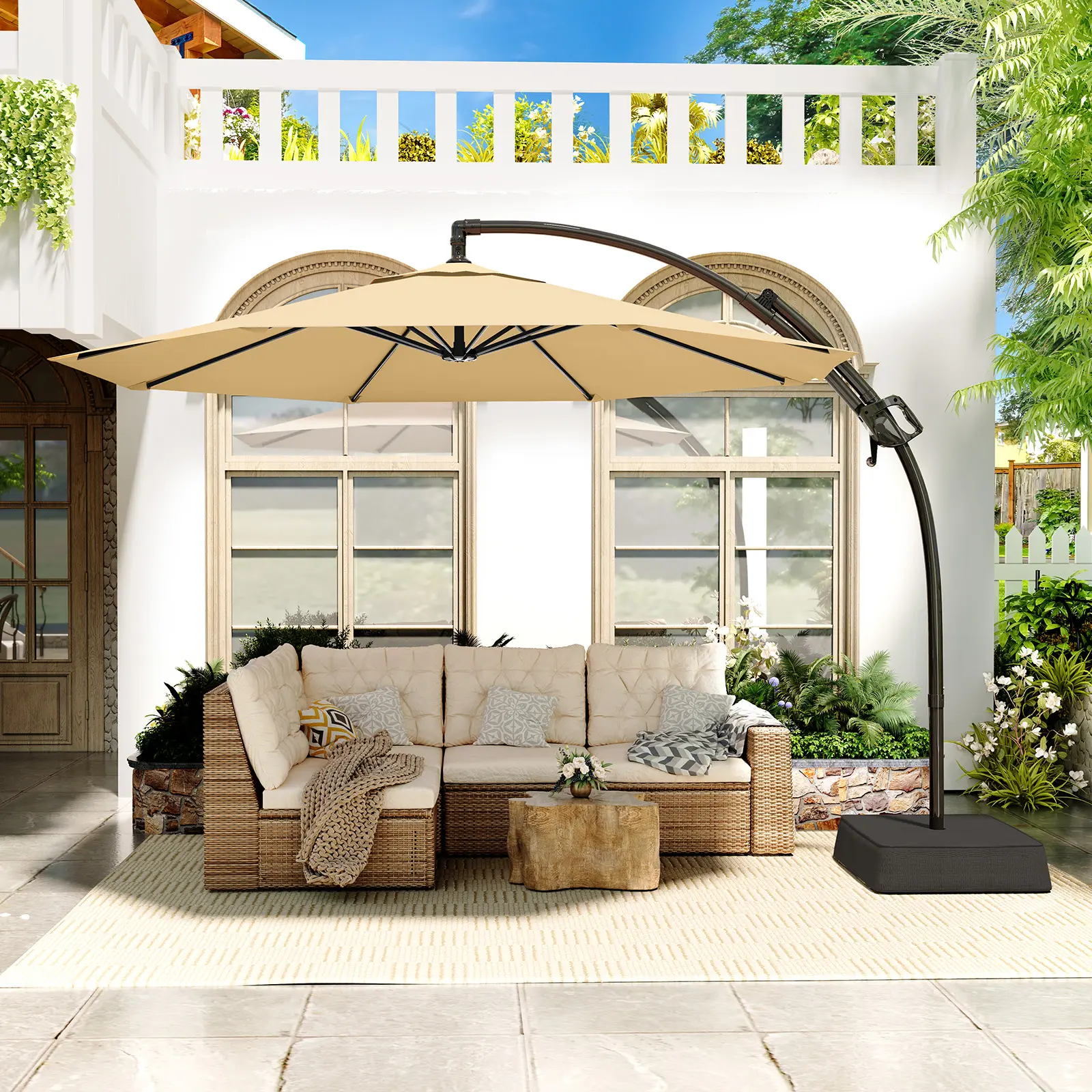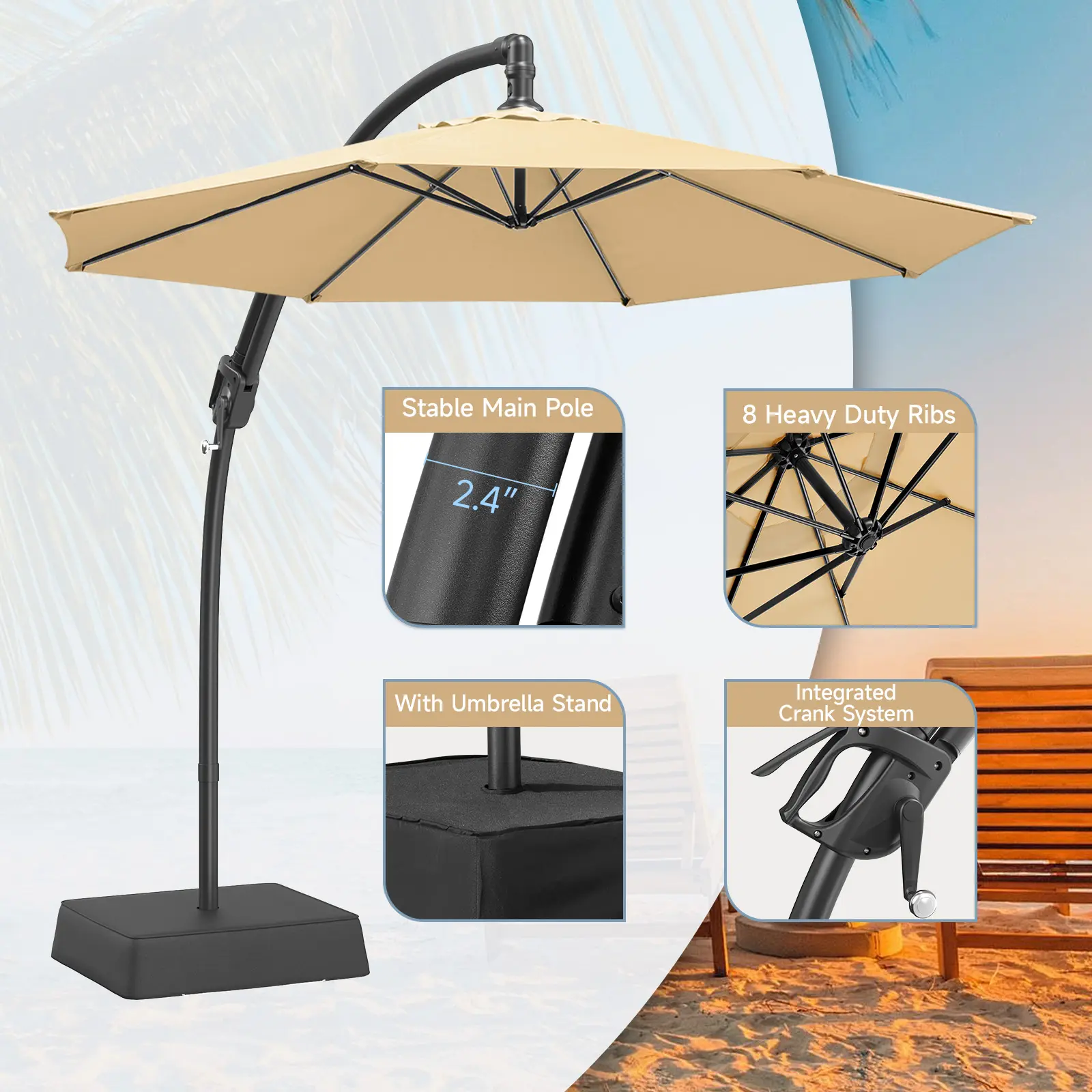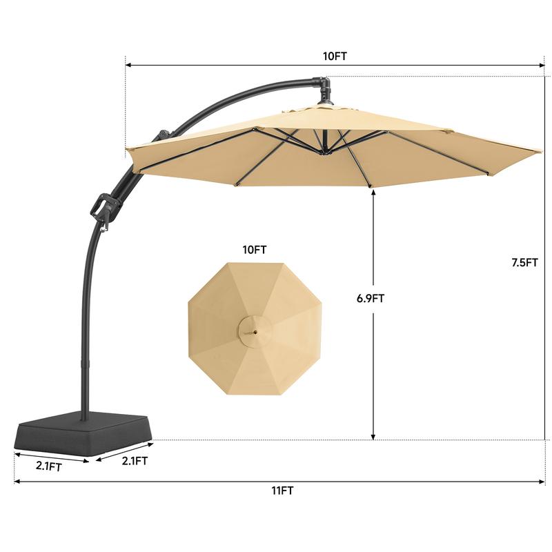 ·【US Standard Class 4 Color Fastness】The fabric of the cantilever umbrella drips effortlessly during storms, dries quickly without being dull, and its hue resists the slow loss of time. Enduring shade season after season in the relentless sun, as the years pass, this deck umbrella still maintains its American standard of Class 4 color fastness, which is a silent guardian.