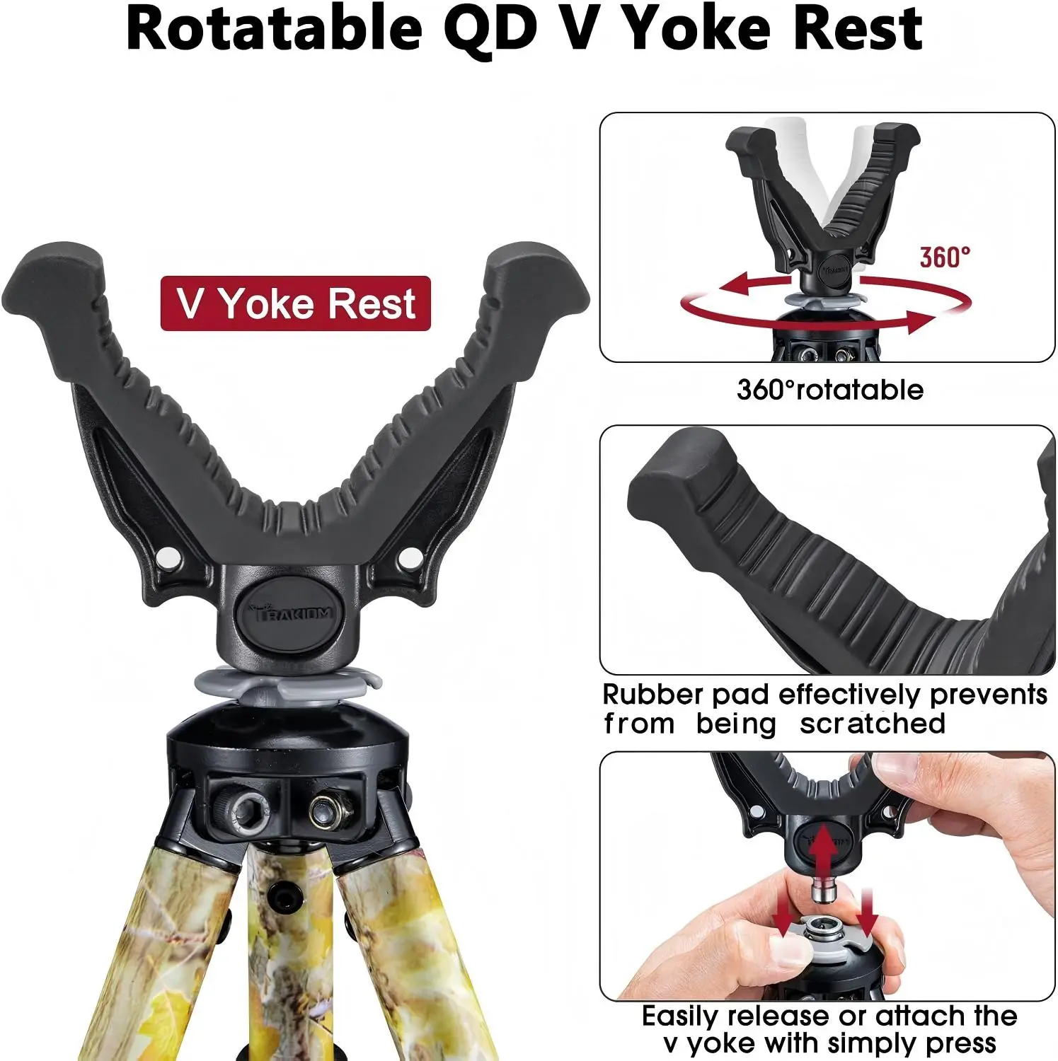 ·The Rubber V Yoke Rest features a 360-degree swivel for smooth adjustment.