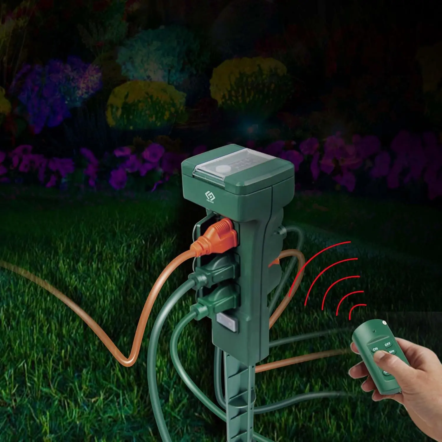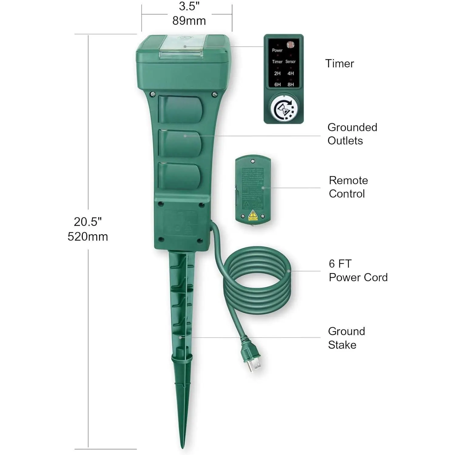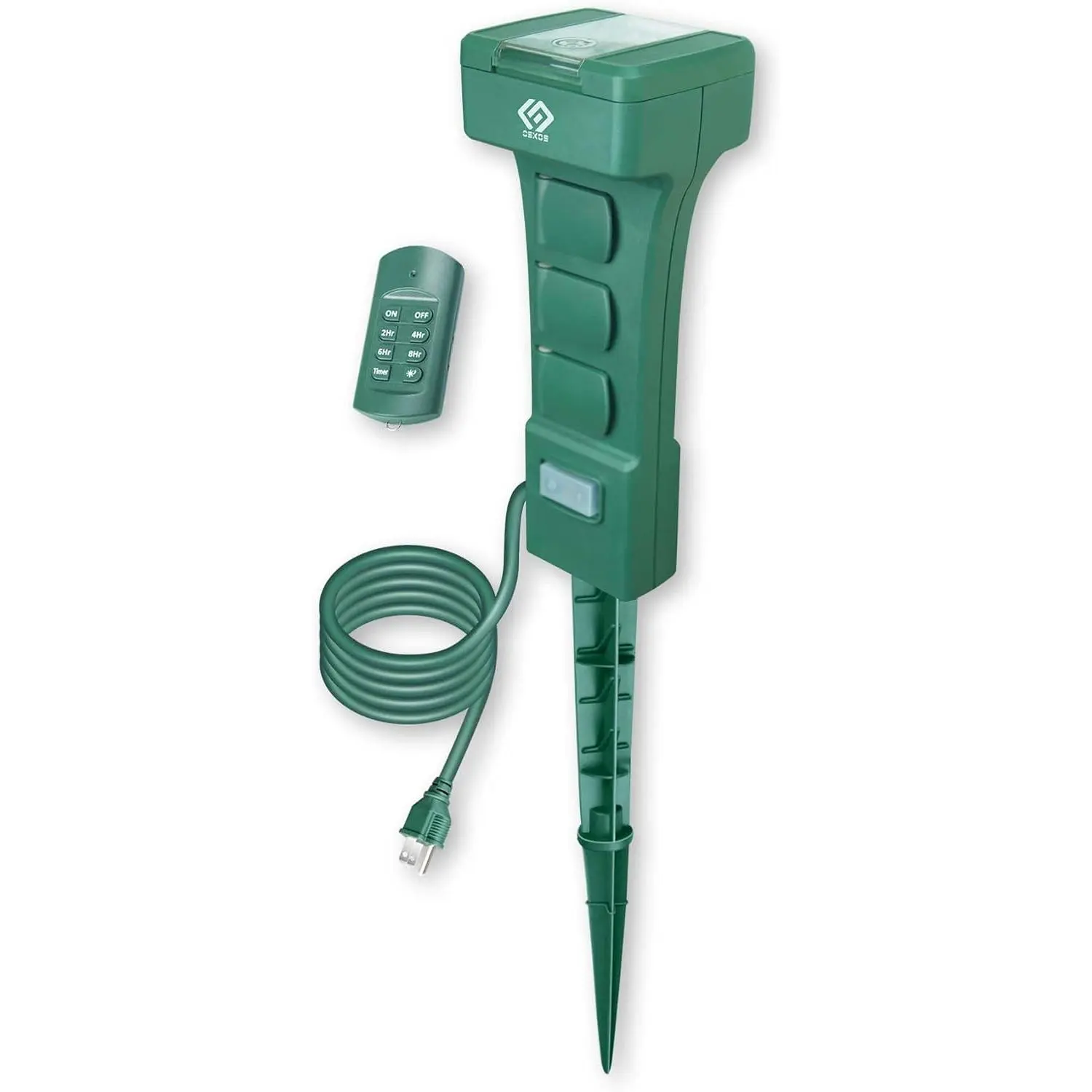 Remote Control Grounded Power Stake can be operated via the included transmitter from up to 100 ft (30.48 M) away or manually press the button on the power stake to select desired function. It gives you tons of outlets where you need them most so you can easily power up your lights and devices and keep them running smoothly. The 6-foot cord allows you to position the stake adjacent to your home or power source. The Outdoor Remote Control Grounded Power Stake with Timer uses a built-in photocell sensor so you can ensure that your lights come on every day at a specific time relative to sunset or from dusk all the way until dawn. Multi-Setting timer from 2, 4, 6 or 8 hours or dusk to dawn. It is great for holiday decorations and general use. For outdoor use.