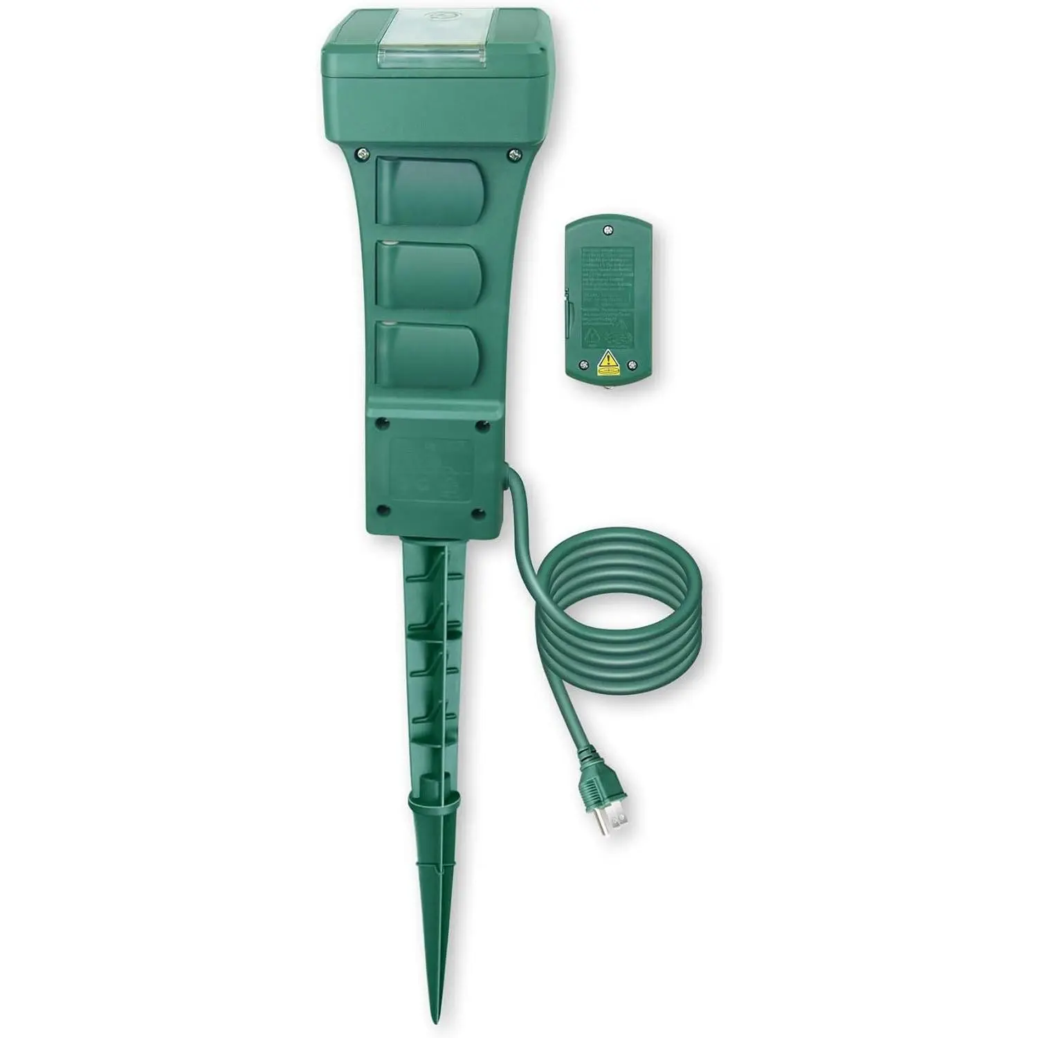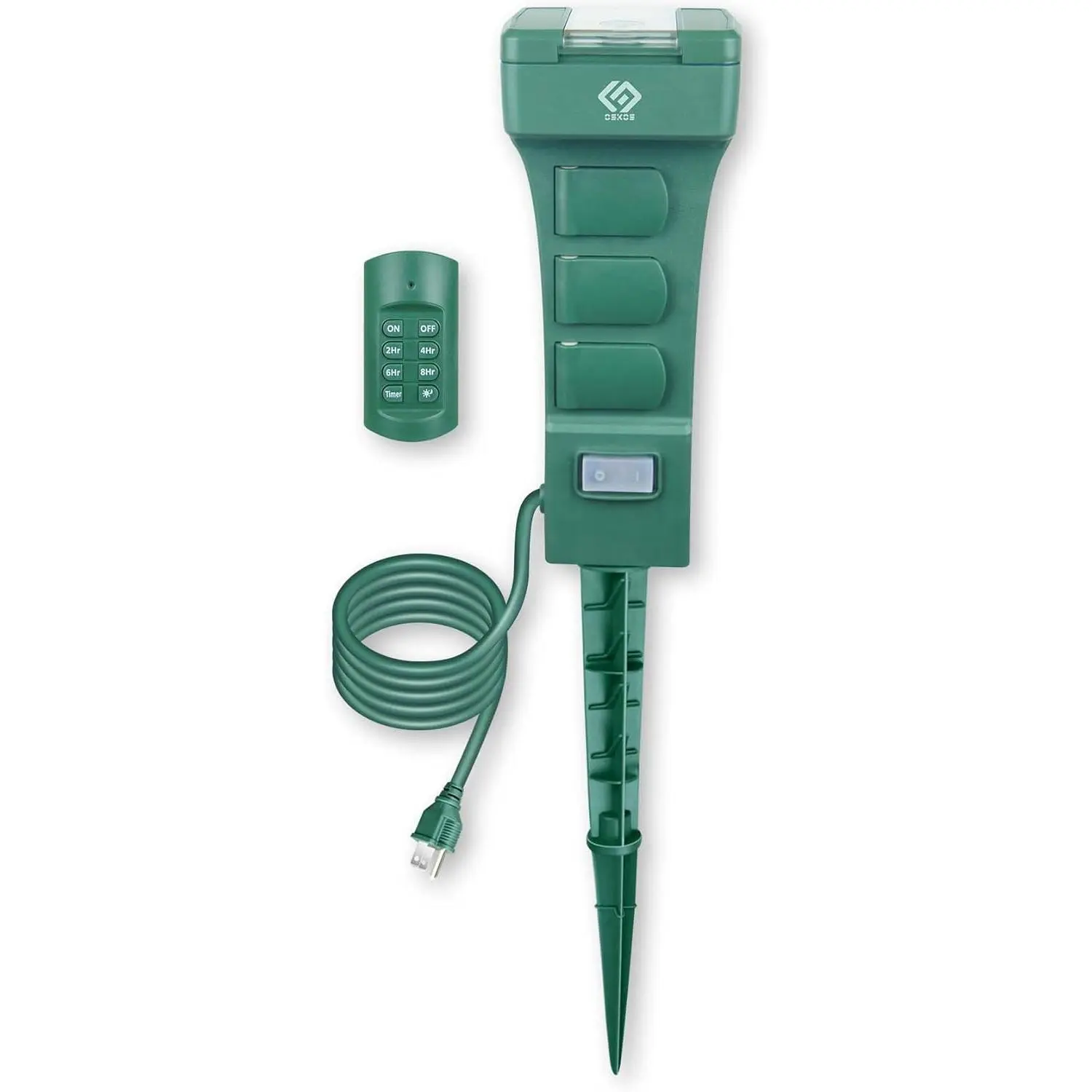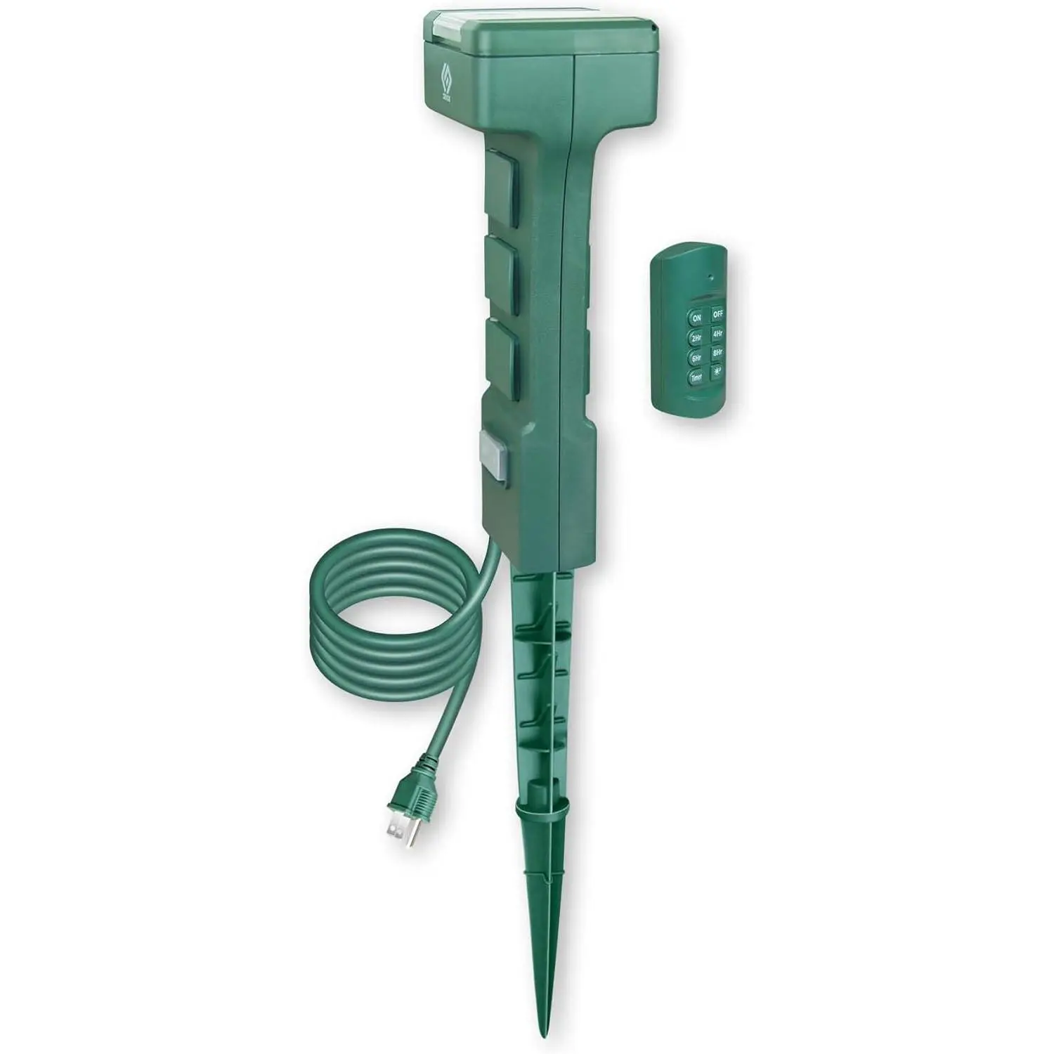 Remote Control Grounded Power Stake can be operated via the included transmitter from up to 100 ft (30.48 M) away or manually press the button on the power stake to select desired function. It gives you tons of outlets where you need them most so you can easily power up your lights and devices and keep them running smoothly. The 6-foot cord allows you to position the stake adjacent to your home or power source. The Outdoor Remote Control Grounded Power Stake with Timer uses a built-in photocell sensor so you can ensure that your lights come on every day at a specific time relative to sunset or from dusk all the way until dawn. Multi-Setting timer from 2, 4, 6 or 8 hours or dusk to dawn. It is great for holiday decorations and general use. For outdoor use.