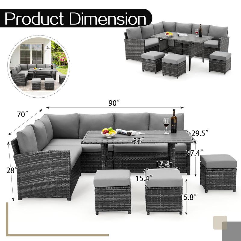 The patio sectional table includes 2 single armrest loveseats, 1 corner loveseat, 1 table, 3 ottomans, 13 cushions. This patio sofa dining set is light enough to move around and easy to place in different configurations.