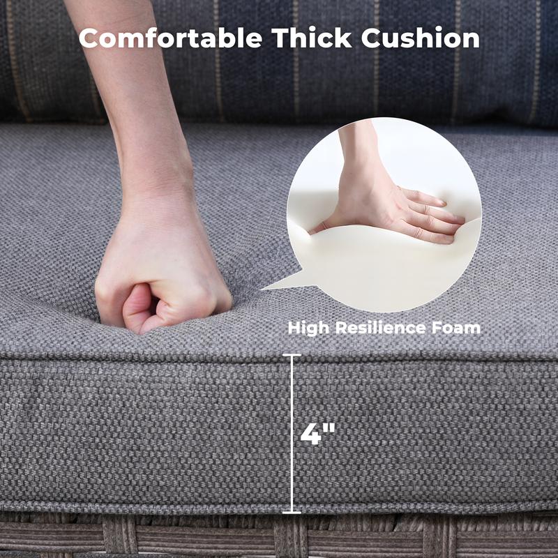 Weight capacity Each Seat: 250 LBS Seating Inner Frame Material Steel Frame Seating Outer Frame Material PE Wicker Wicker Durability Water Resistant; UV Resistant Cushions Included 11 Unit Cushion Durability Water Resistant; UV Resistant Cushion Thickness 3.54" Cushion Attachment Type No Direct Attachment Method Removable Cushion Cover Yes Cushion Cover Closure Method Zipper Cushion Fill Material Foam/Cotton Cushion Cover Material Fabric