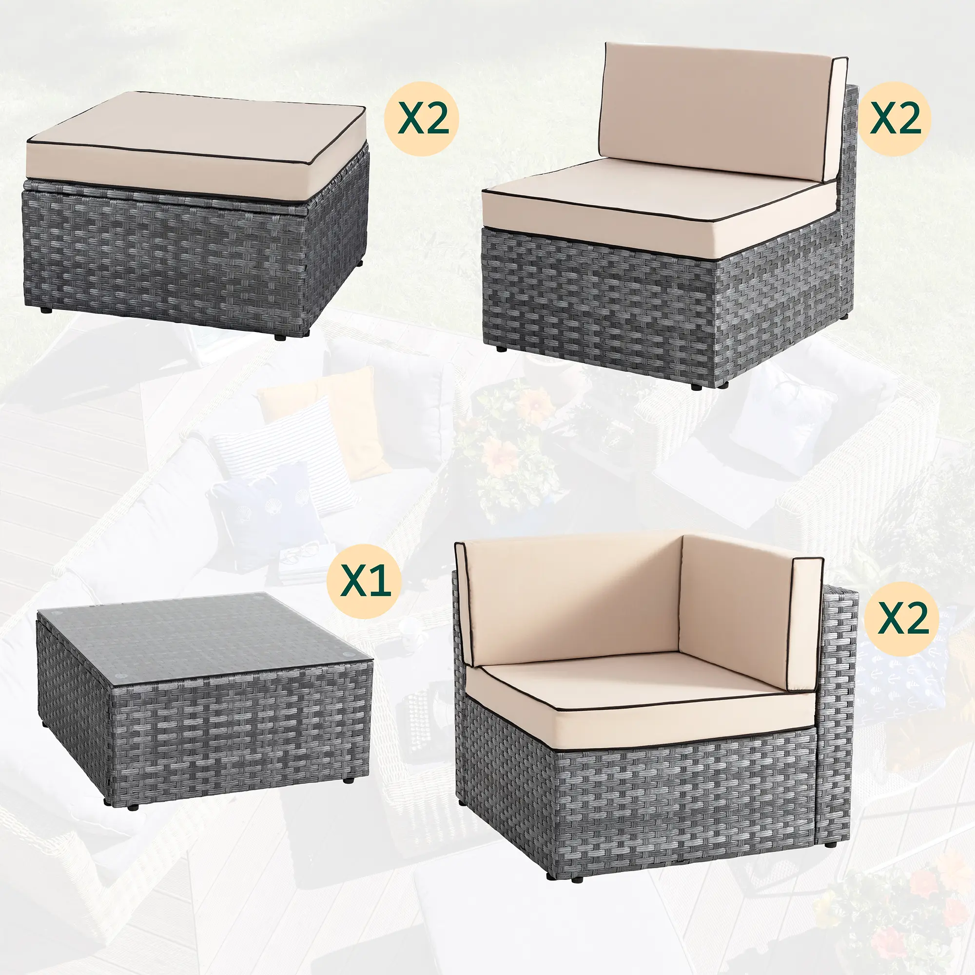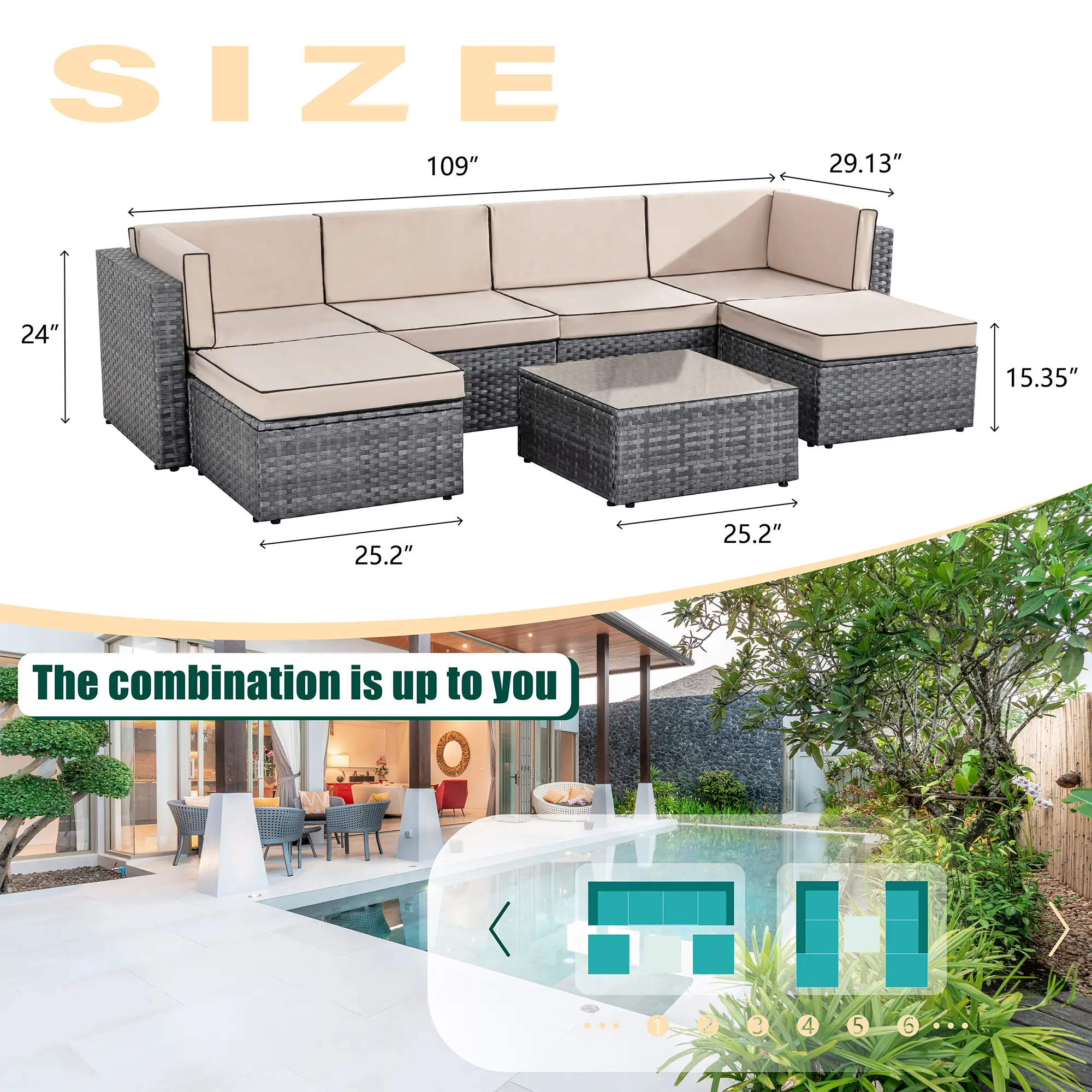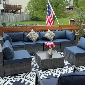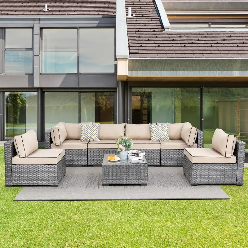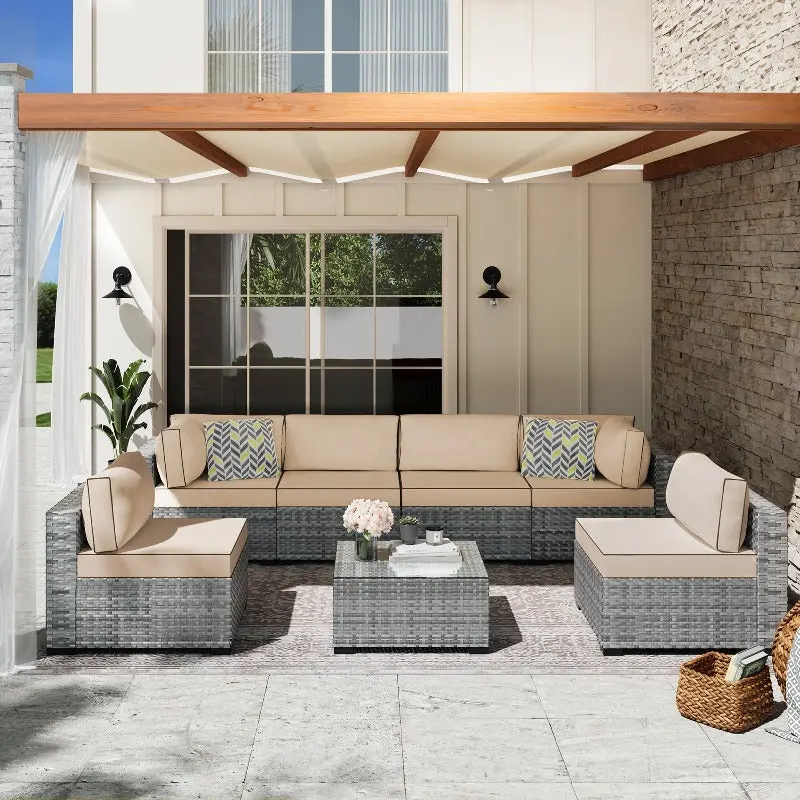 ¡Modular Design: This outdoor sectional sofa set includes 2 corner chairs, 4 armless chairs, and 1 glass-top coffee table that offer flexibility and many layout combinations. The sectional seats connect to each other with a connector clip so they will not separate. Weight Capacity: 350 lbs