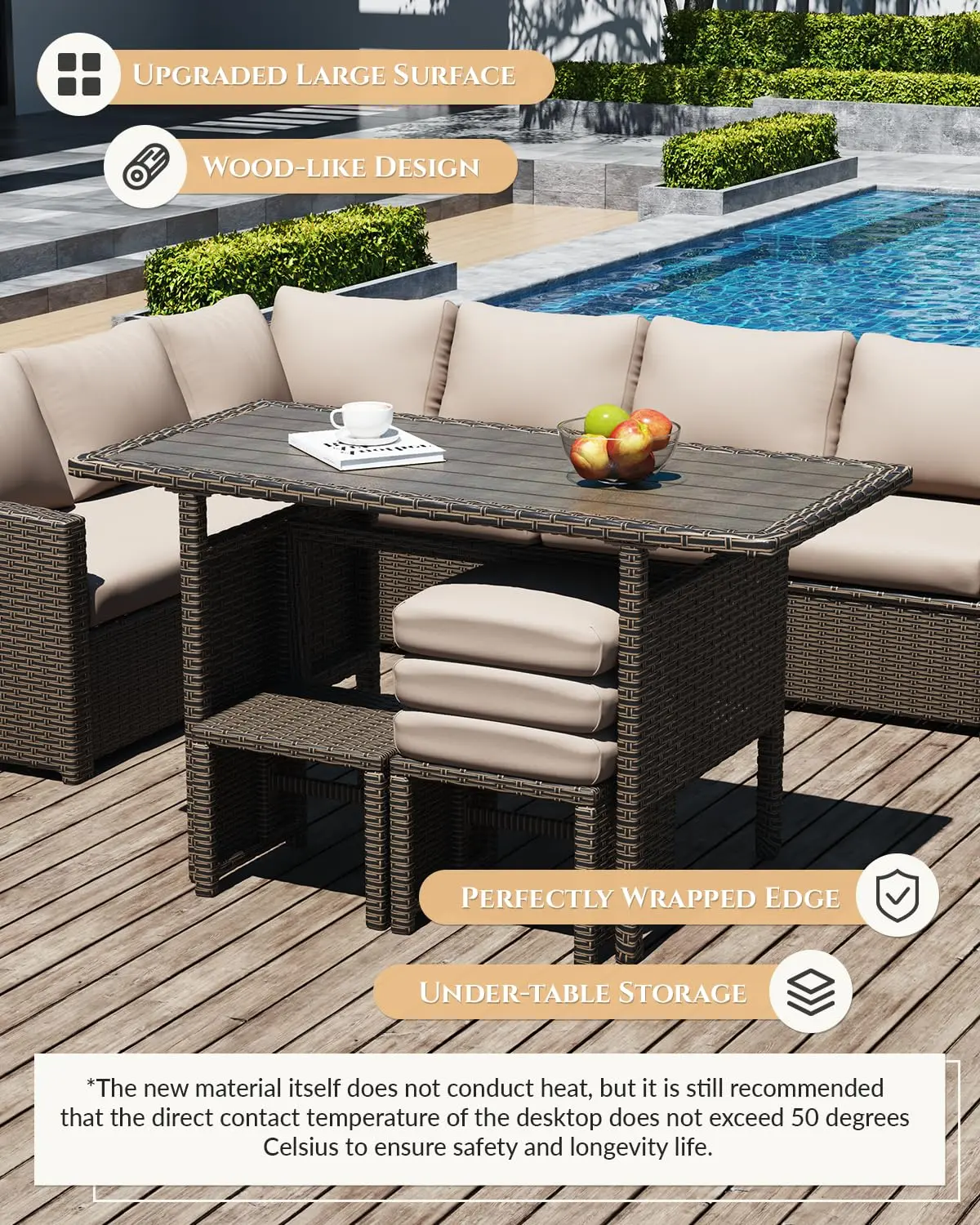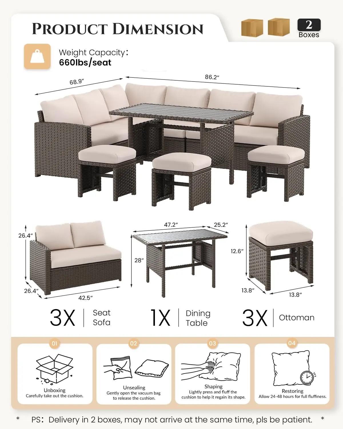 ·Packing Included: You will receive 3 x Ottoman Chairs, 3 x Corner Sectional Loveseat Sofa, and 1 x Patio Dining Table. All necessary hardware and instructions are included, along with two people for assembly and handling.