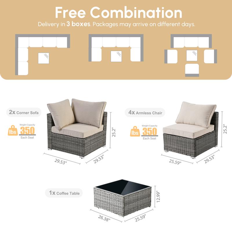 ·Patio Furniture Set:OVIOS patio furniture set come in 3 boxes.Each package includes 2 corner chair,4 armless chair,1 coffee table,6 seat cushion,8 back cushion