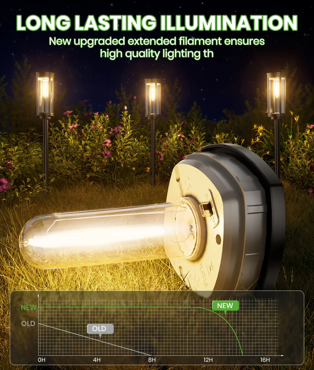 BITPOTT solar garden landscape lights feature powerful rechargeable 3.7V/1.85WH batteries. They provide up to 12-14 hours of lighting after a full charge. Automatically turning on at night, these lights ensure bright and reliable illumination throughout the night. No need for constant manual operation.