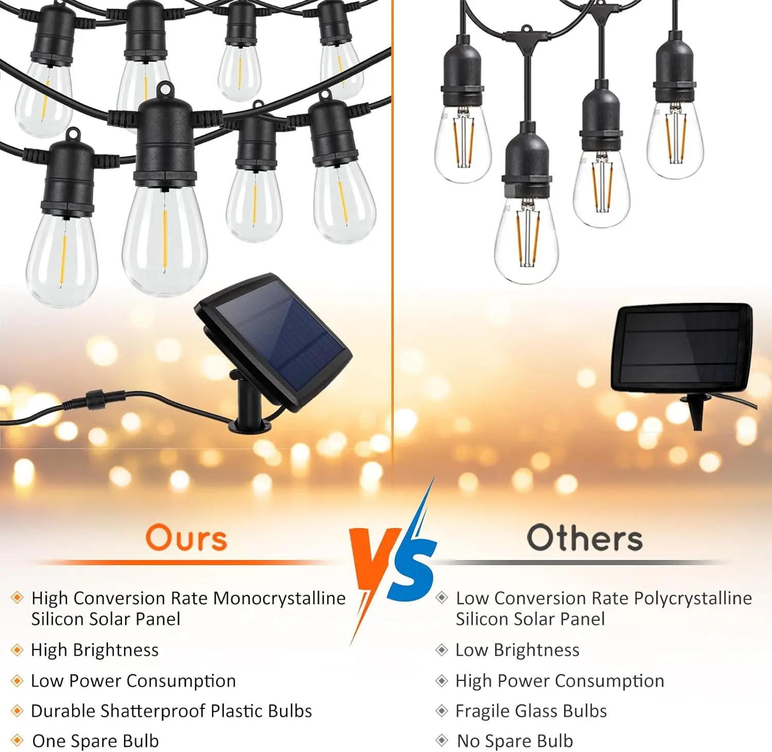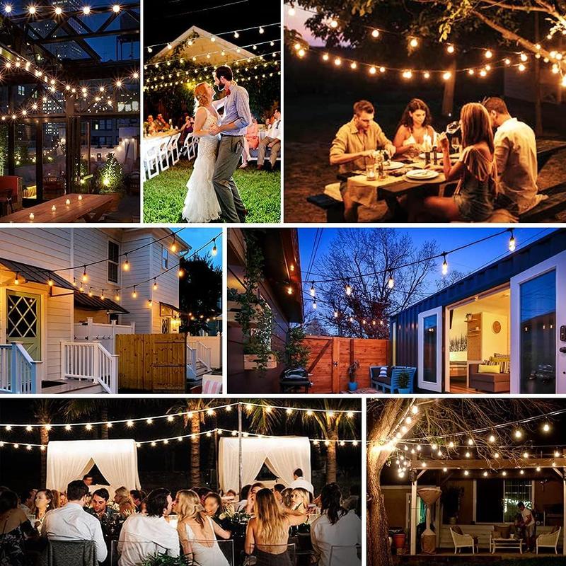 ·【All Weather-resistant & Shatterproof Outdoor Lights】Designed with strong rubber strands and fully-sealed sockets, our solar outdoor lights will work well in all weather conditions: rain, snow wind, storm, etc. Crafted with lightweight yet shatterproof plastic bulbs, these string lights will ensure enhanced safety. A brilliant choice for various occasions such as parties, camping trips, weddings, and all outdoor spaces like patio, yard, pergola, bistro, and umbrella.