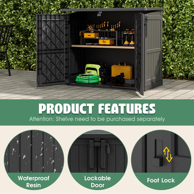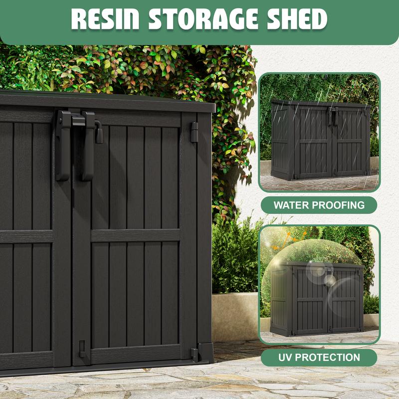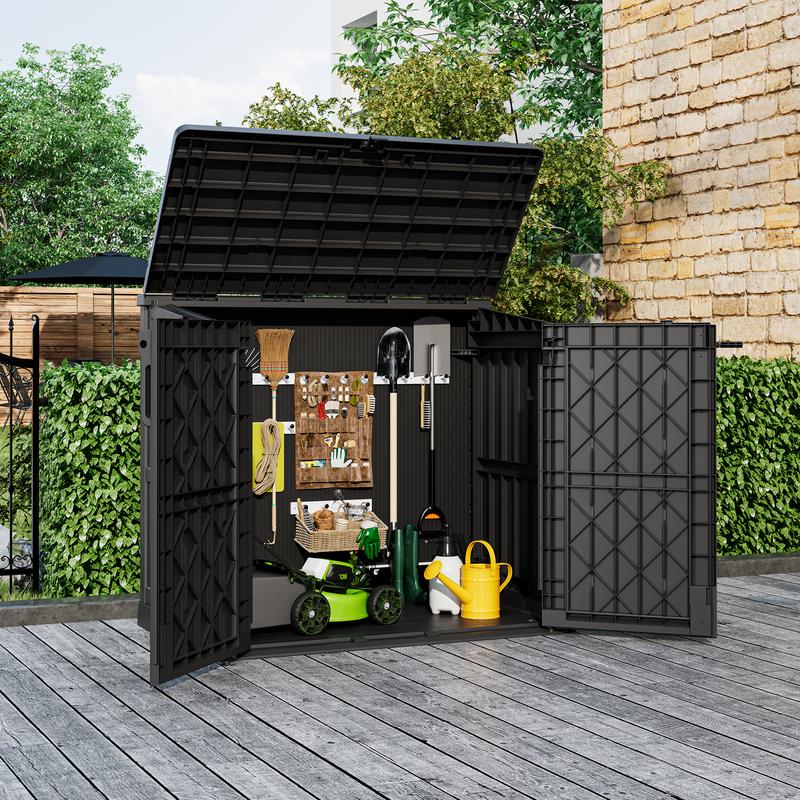 Crafted from high-quality waterproof resin and durable solid plastic, this storage box resists rain, sun, and harsh weather, ensuring long-lasting use without rust or rot. The roof supports up to 15 pounds per square foot, allowing you to place small items (like potted plants) on top for extra space utilization.