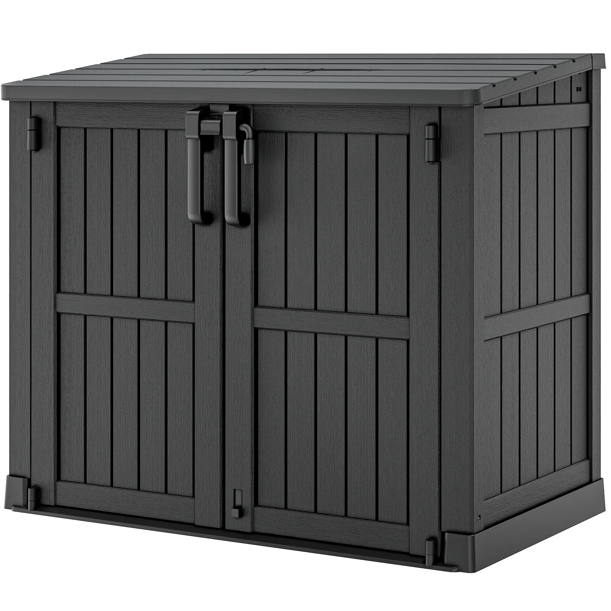 This outdoor storage room offers a spacious solution for your needs. It features a 15 lbs. per sq. ft. roof capacity and a 36 cu. ft. storage capacity. The room includes a waterproof resin lockable door and a step latch for secure access. Ideal for tool storage, utility rooms, pool supplies, and small trash cans. Dimensions: 51.1 feet long, 29.1 feet wide, 43.3 feet high.