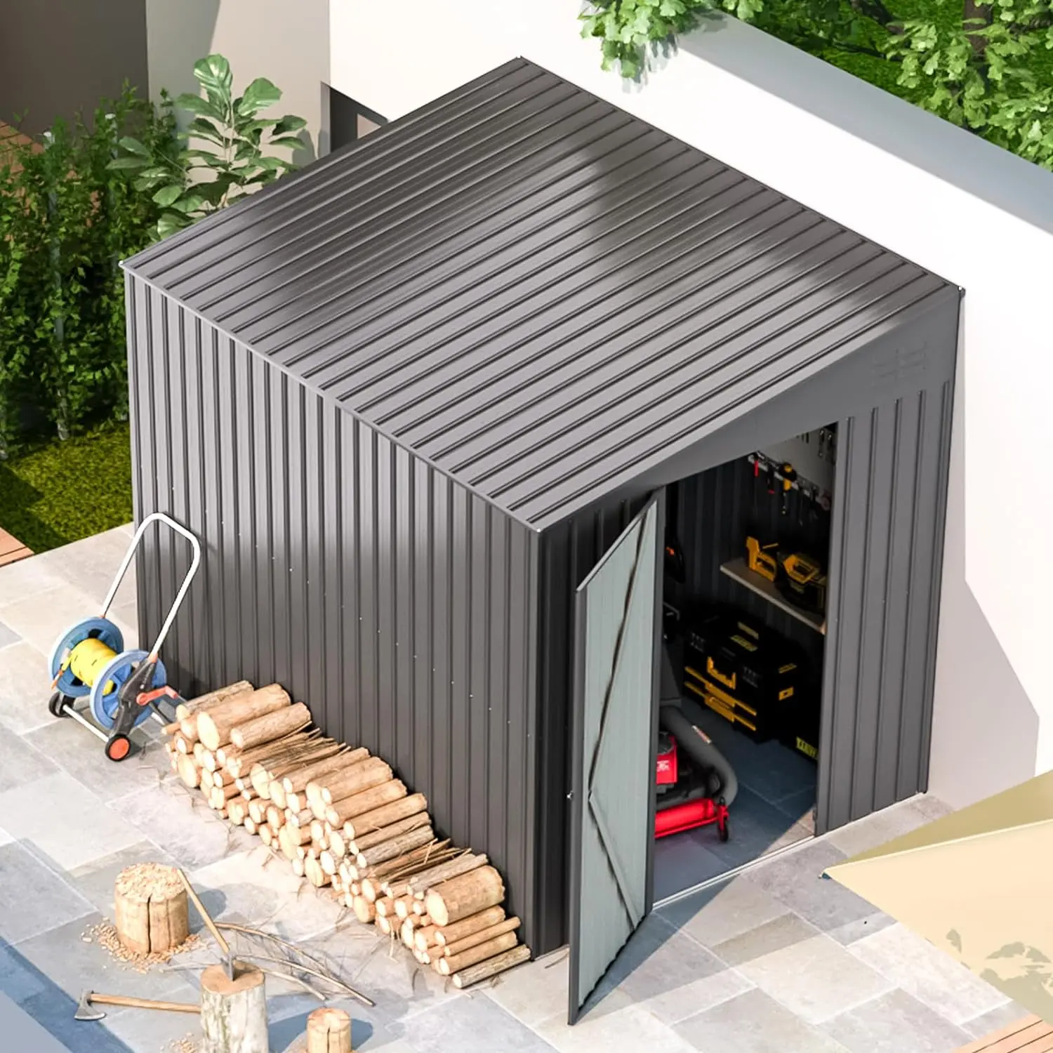 ·Outdoor Storage Solution: This top-notch storage shed boasts a generous 48 Sq.Ft footprint, with the door measuring 2.3'. Capable of accommodating 8 lawnmowers, 12 bikes, 8 snowmobiles, or 3 Vespa motorcycles, its ample dimensions cater to all your outdoor storage needs.
