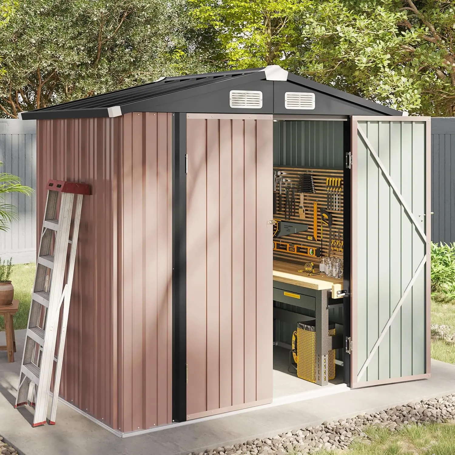 ·The shed's sloped roof maximizes interior space and prevents rainwater accumulation. Strategically placed vents enhance airflow, maintaining a breathable environment. Secure, padlock-ready doors offer easy access and heightened security.