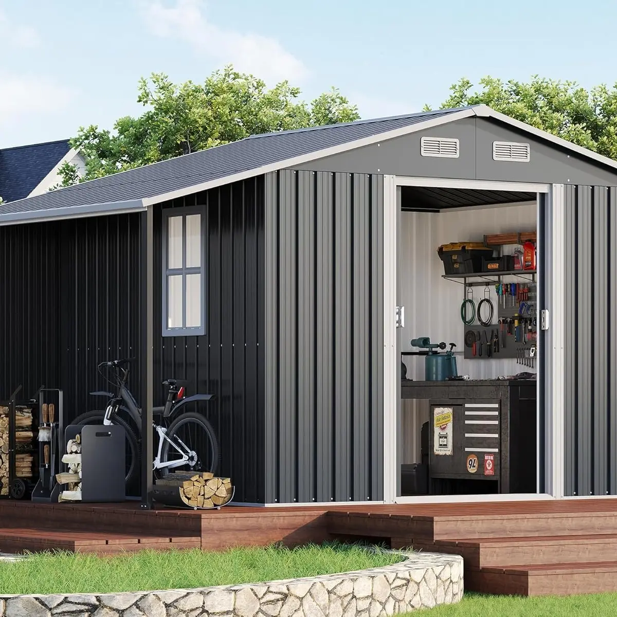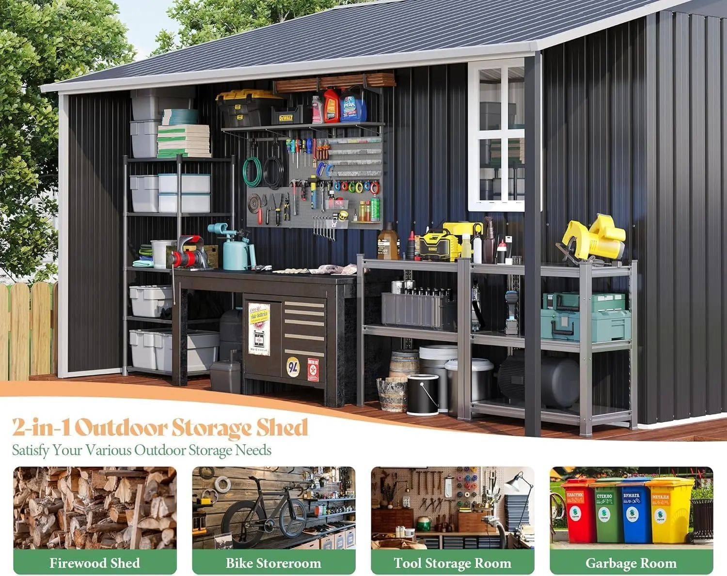 ·Maximize Storage Space: This storage shed is equipped with a outdoor wood storage space, bring organization to your garden. A Ideal for storing tools, firewood, garden furniture and equipment