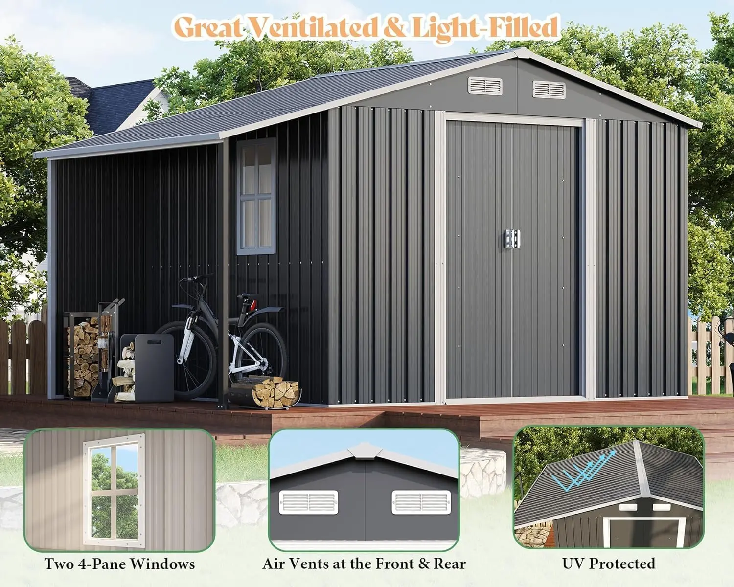 ·Light-Filled & Great Ventilated: Equipped with two 4-Pane Windows, the Metal shed allows light to fill the interior. Additionally, built-in vents ensure proper air circulation, reducing moisture buildup