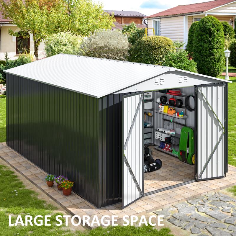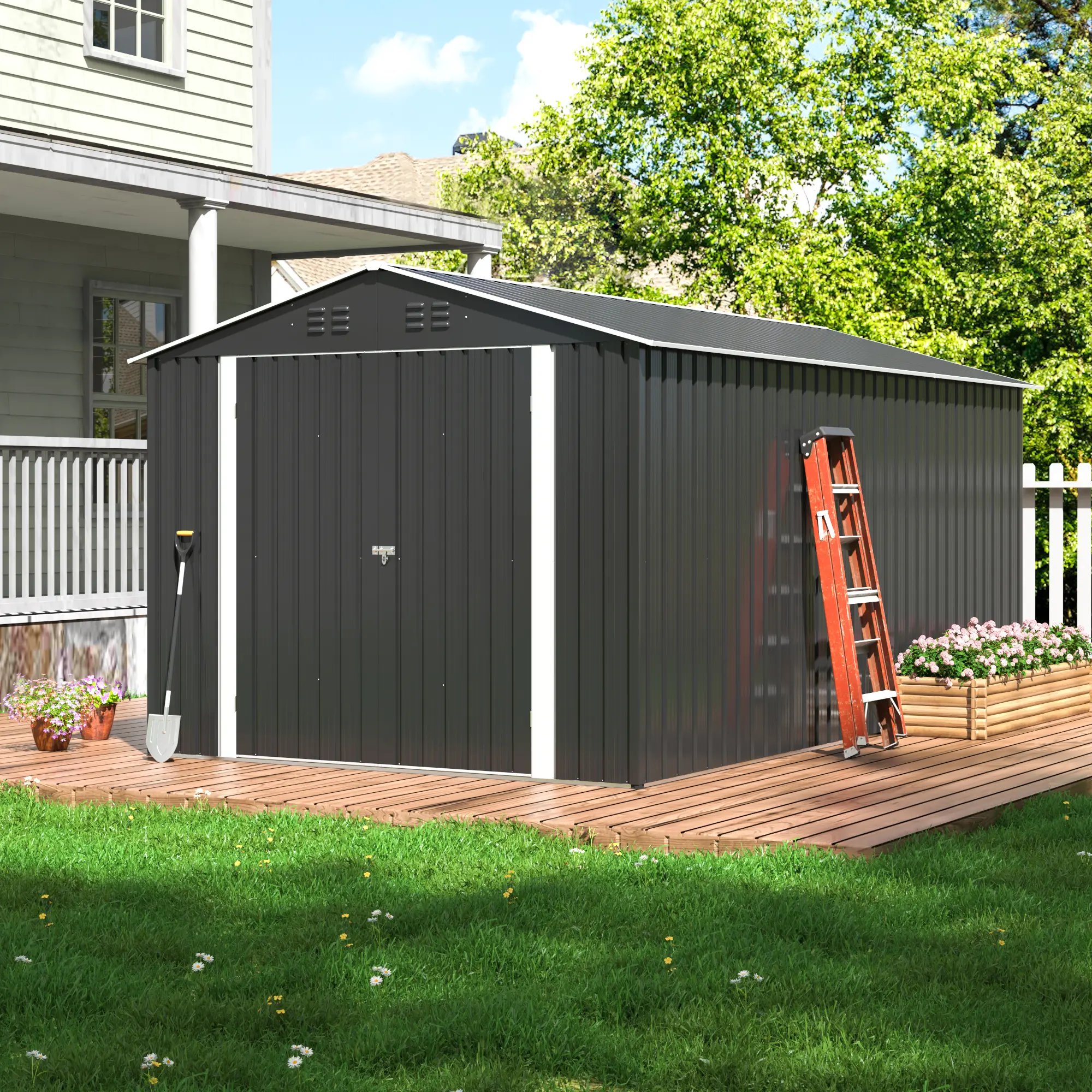 ·🛡️ The shed includes a lockable door, a water-shedding sloped roof, ample ventilation, and tough corner protectors. These design elements ensure lasting utility and security.