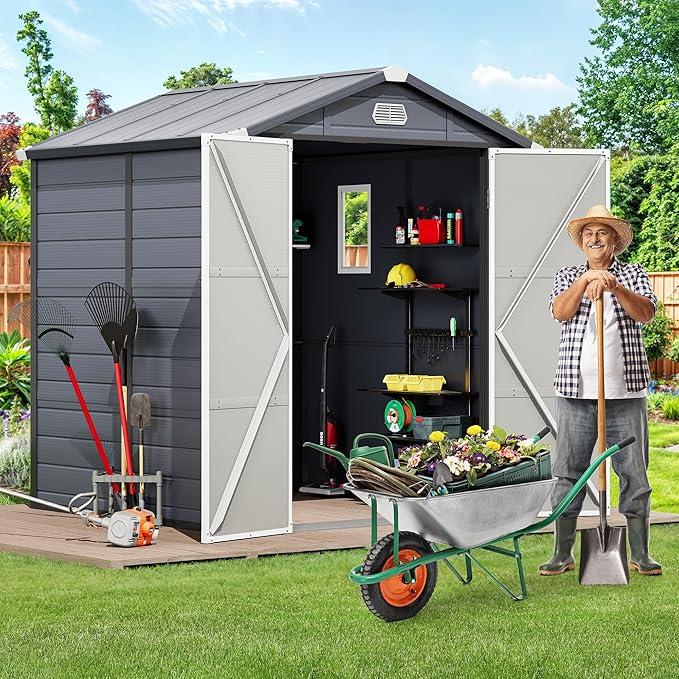 Sufficient Storage Space: The 6.3x6.2ft garden shed offers external dimensions of 70.8’’L x 70.8’’W x 86.2’’H, providing versatile storage for garden tools, lawn equipment, and bicycles; It can also serve as a comfortable pet shelter or plant greenhouse