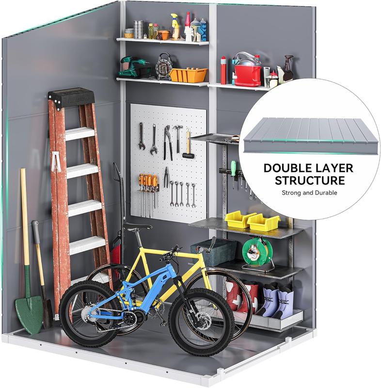 HEAVY-DUTY FLOOR: The bike storage shed features a 12mm thick double-layer resin floor that offers additional protection to keep stored items clean and dry; The durable PVC floor is wear-resistant, capable of supporting heavy equipment while enhancing flat surface stability