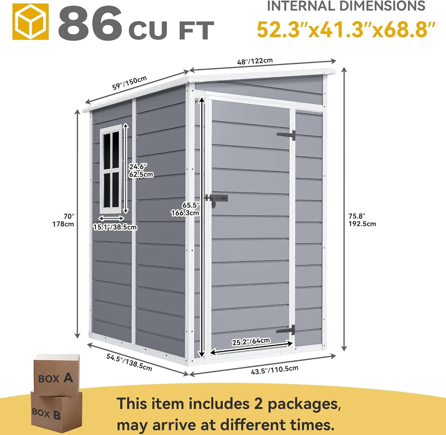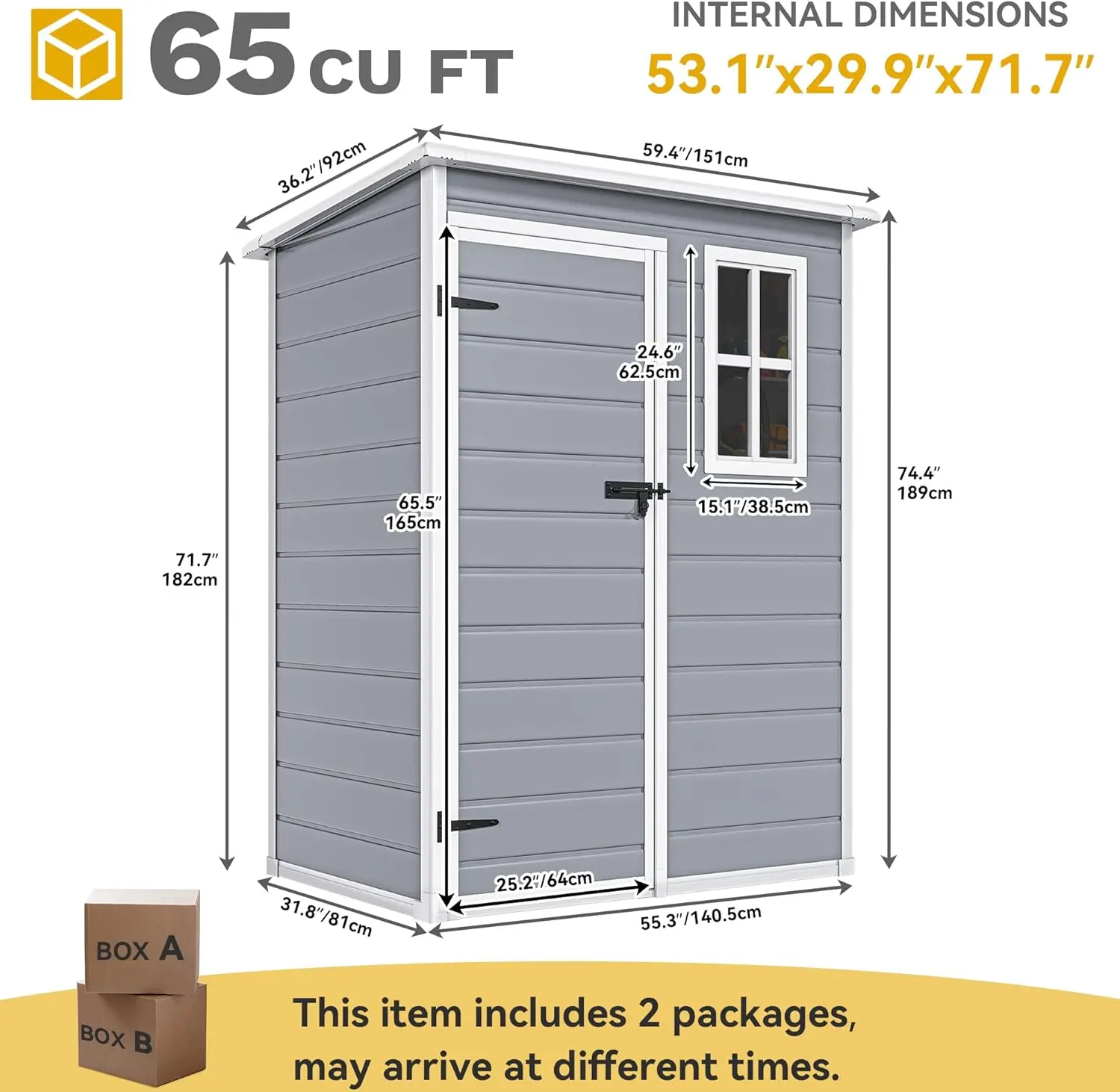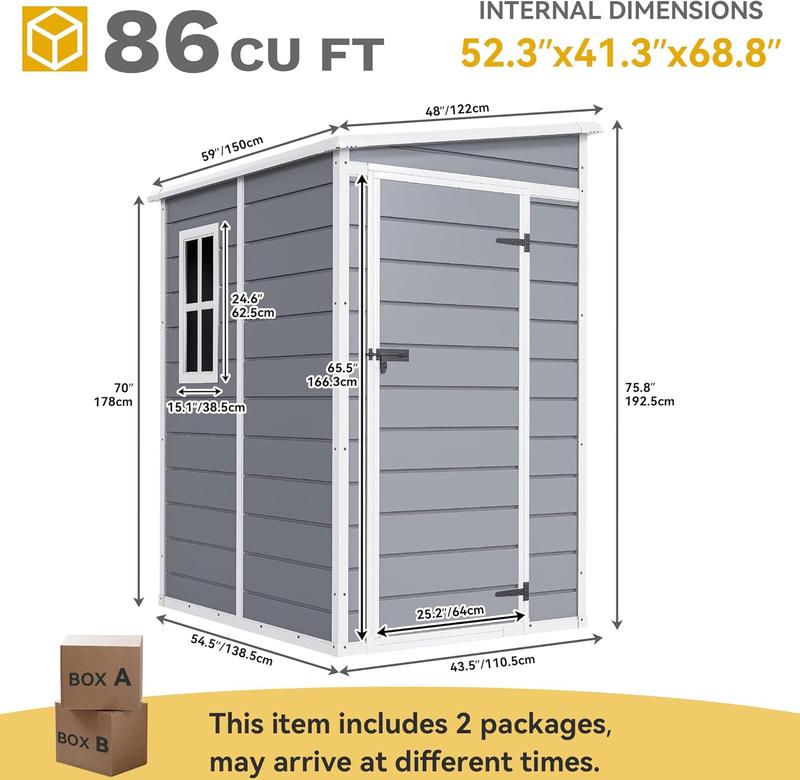 EASY ASSEMBLY: This outdoor plastic shed is easy to install, requiring no special tools or professional knowledge; The package includes all necessary components, labeled parts, and a detailed installation guide; Note: The product will be delivered in two separate packages for logistical purposes, and they may arrive at different times