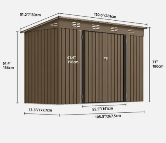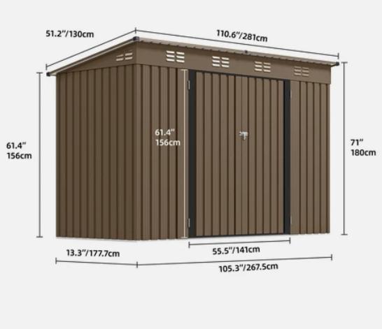 Spacious organizer - The exterior dimensions of this garden storage shed are 105.31 "long *46.34" wide *70.87 "high and the door dimensions are 55.83" W *61.42 "H, providing plenty of space for snow blowers, lawn mowers, outdoor chairs, bicycles, BBQ grills, generators, dumpsters and more.