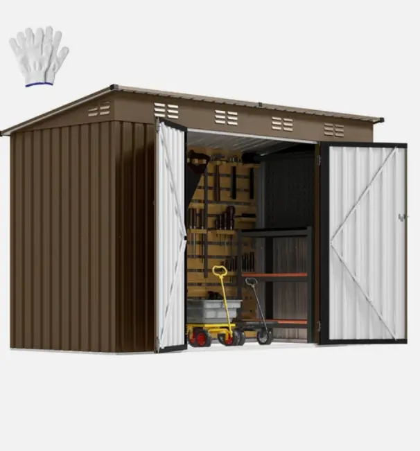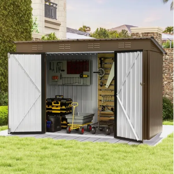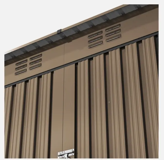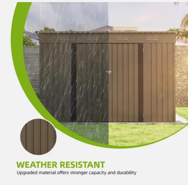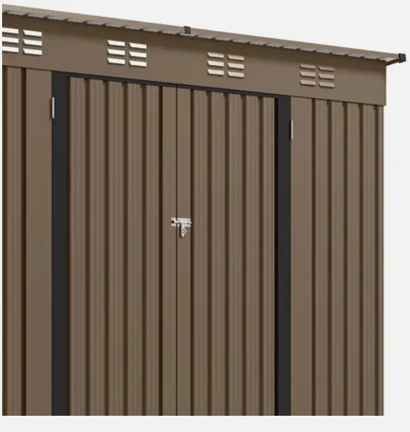 All-weather practicality - reinforced galvanized steel and durable frame coordination provide great rust protection for this outdoor storage shed; The overlapping wall panels work with the sloping roof to prevent rainwater from collecting or seeping in for year-round use.