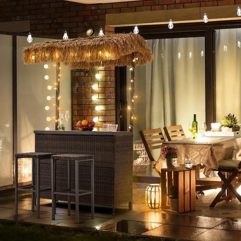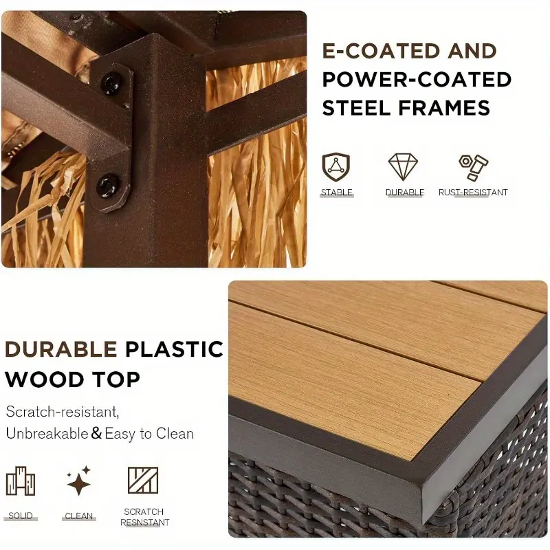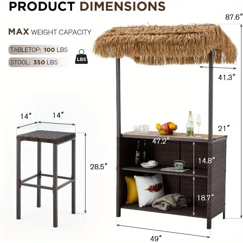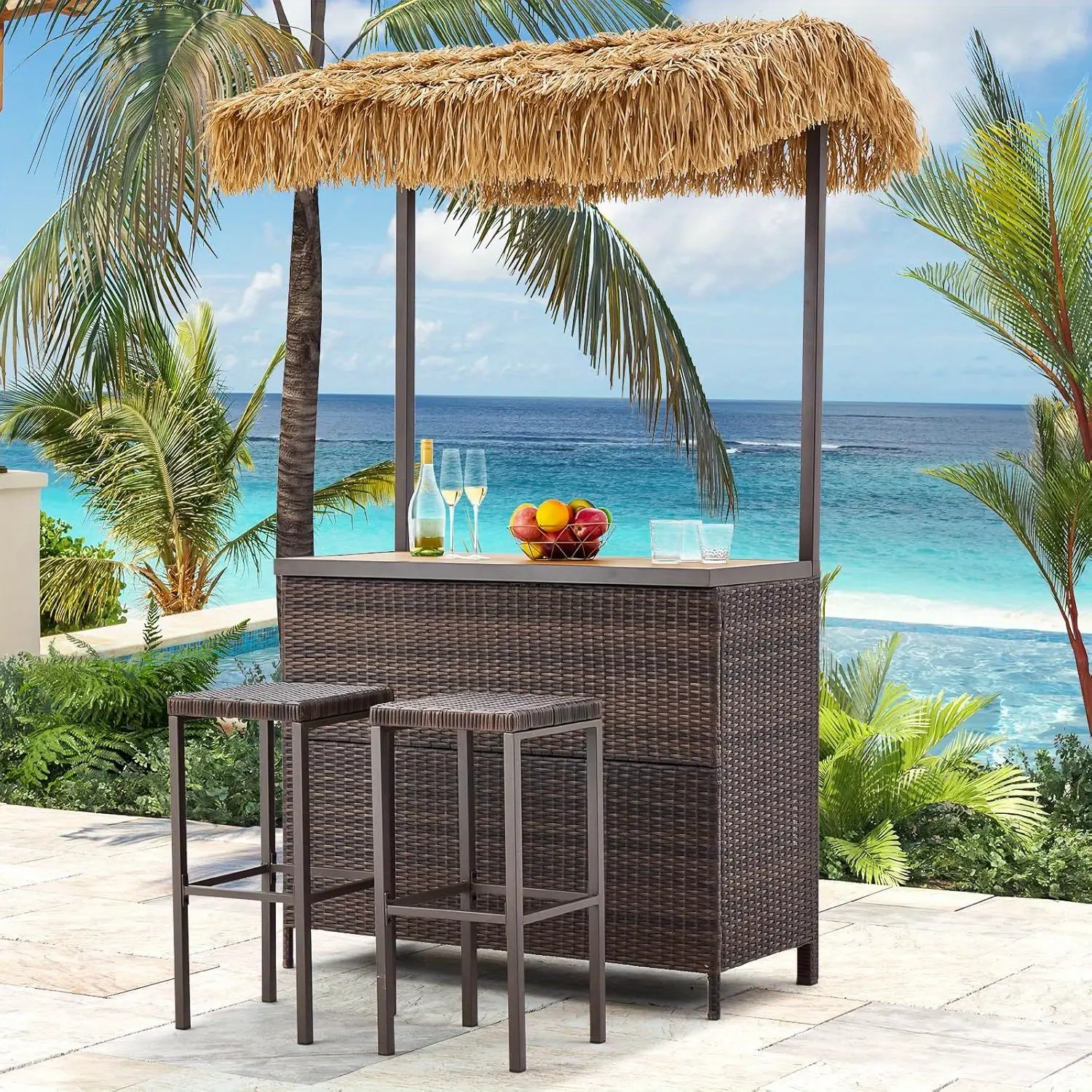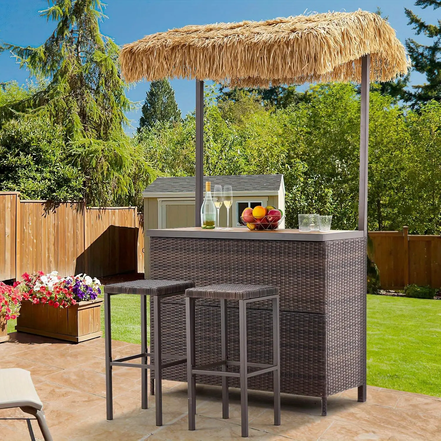 Outdoor Tiki Bar Set, 3 Pieces Wicker Patio Bar Set w/2 Height Stools, Storage Shelf, Canopy, Plastic Wood Tabletop for Backyard Poolside Garden, BrownOutdoor Tiki Bar Set, 3 Pieces Wicker Patio Bar Set w/2 Height Stools, Storage Shelf, Canopy, Plastic Wood Tabletop for Backyard Poolside Garden, BrownOutdoor Tiki Bar Set, 3 Pieces Wicker Patio Bar Set w/2 Height Stools, Storage Shelf, Canopy, Plastic Wood Tabletop for Backyard Poolside Garden, Brown