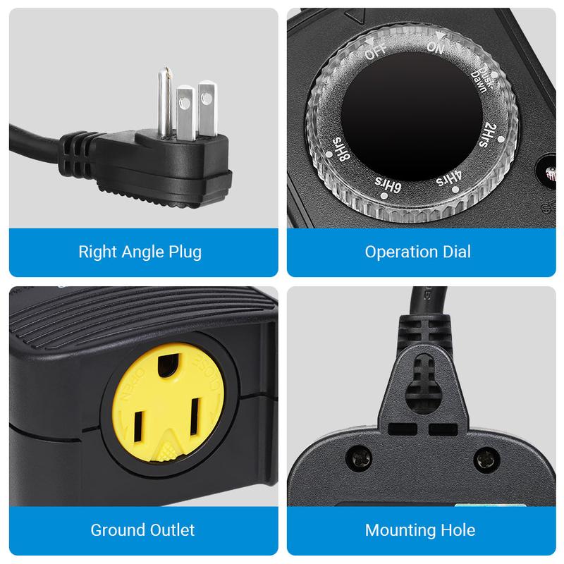 【MULTI TIMER CHOICES】 This timer offers various choices, including a built-in light sensor for automatic or manual lighting schedules based on environment brightness. You can set it to turn on/off according to daylight or remain on/off continuously. It also has the option to turn on at dusk, off at dawn, on at dusk, and off after 2/4/6/8 hours, with daily repetition.【WATERPROOF】The timer is made with waterproof material, allowing it to run even on rainy or snowy days. To prevent water splashing into the outlets, please mount it vertically and at least 2 ft. above ground when used outdoors.【GROUNDED OUTLET】 The timer has a grounded outlet that can control Christmas/holiday lights, outdoor string lights, and other garden decorations. Two timers are available to run two devices simultaneously, and a twist-to-lock safety outlet cover provides protection from rain, snow, and dust.【EASY TO OPERATE】 Operating the timer is easy. Simply plug your devices in and turn the dial clockwise or counterclockwise to choose your desired operation time. This allows you to turn on/off outside and save energy and electric charge.【DURABLE】 Crafted from heavy-duty fireproof PPE material with an 18 AWG SJTW cord, this timer is durable and UL listed, reducing hidden fire dangers and providing superior safety. A one-year warranty is provided.