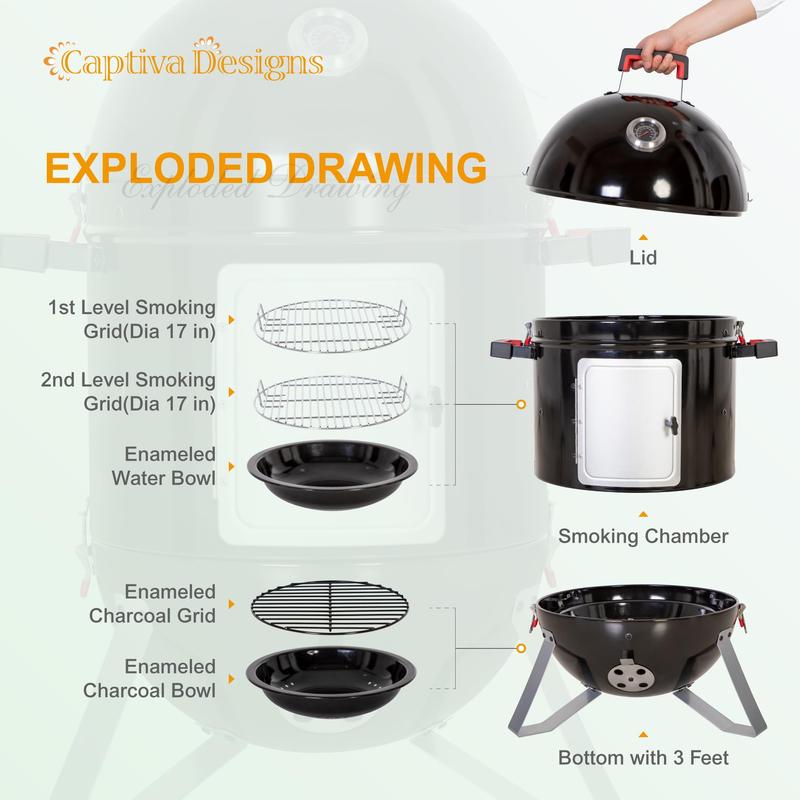 ·Two Spacious Smoking Floors: With a height of 6.7 inches and 7 inches respectively and a diameter of 17 inches, this vertical smoker offers ample space for food smoking on two large floors.