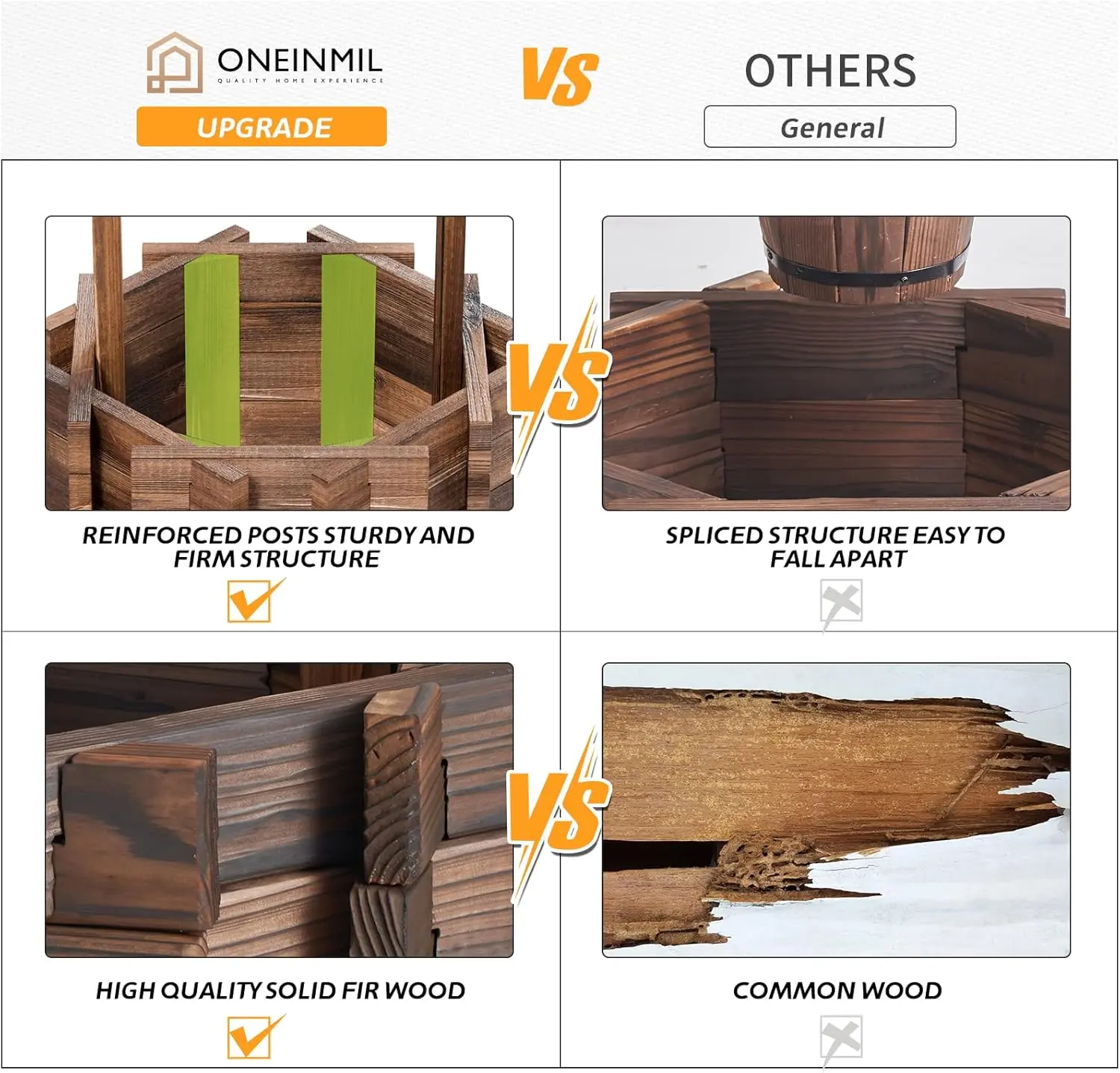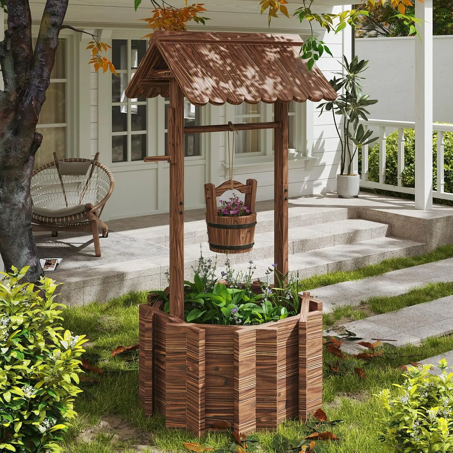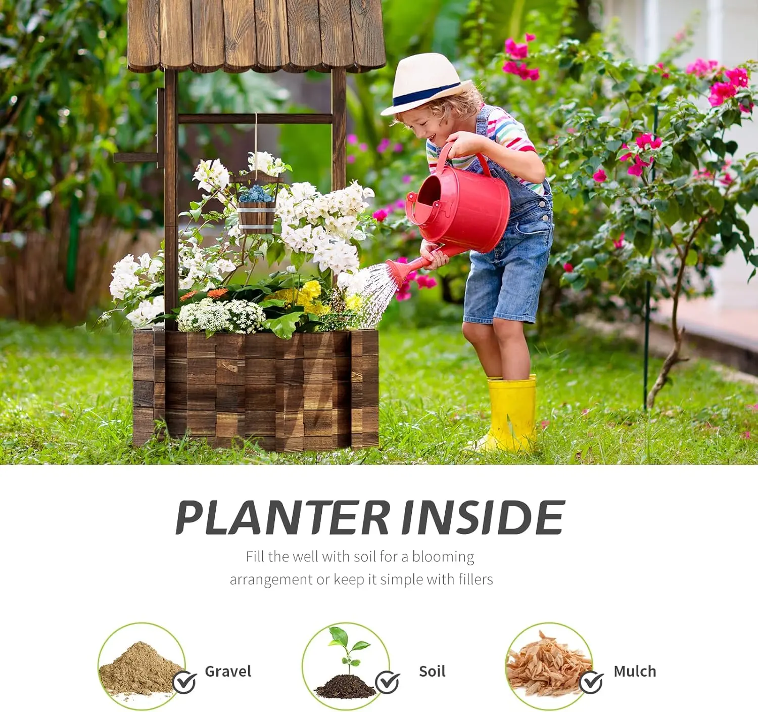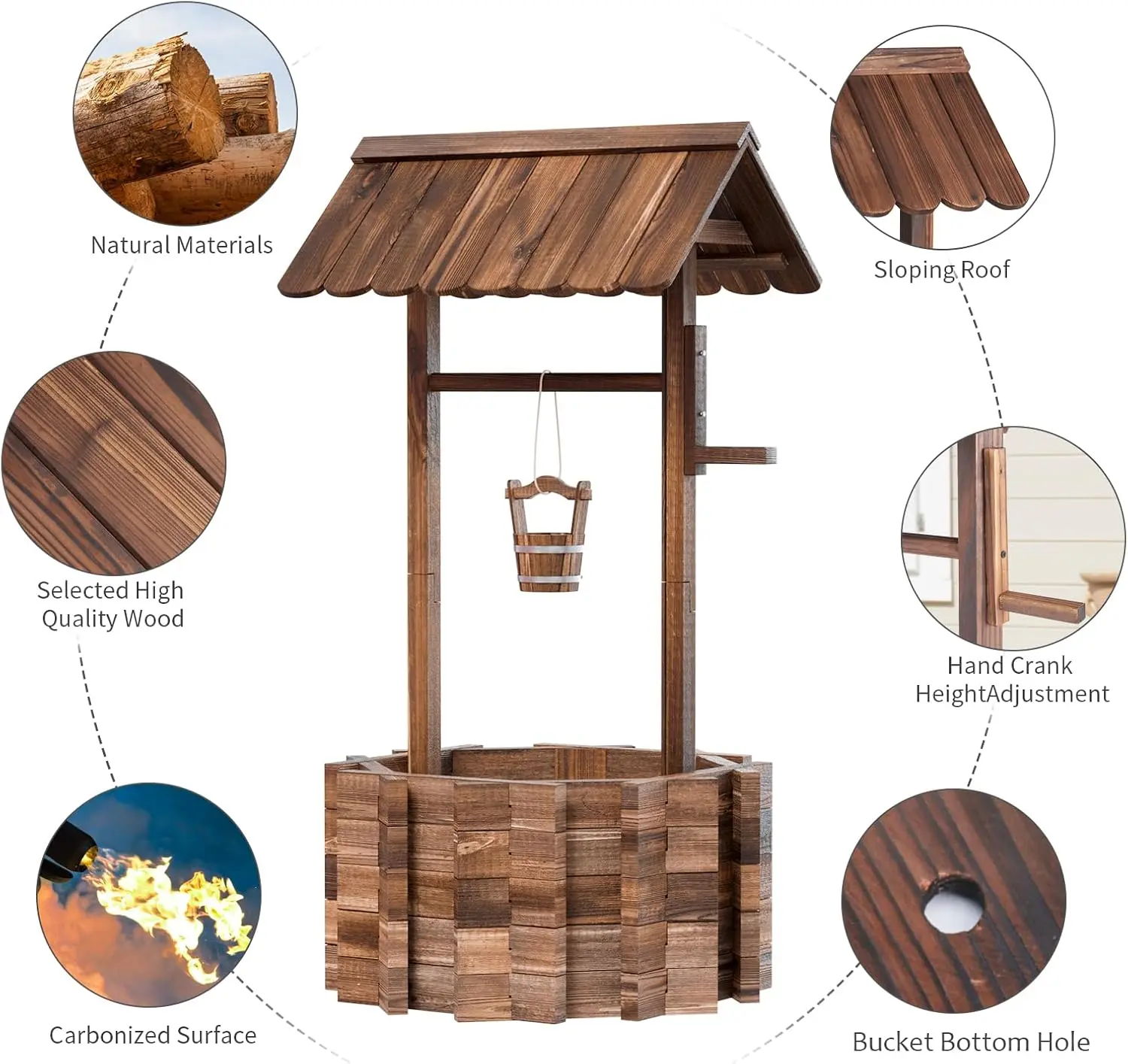 ·Solid Wood Material: The wishing well flowerpots are crafted from high-quality fir, which has been treated with stamping and carbonization to ensure strength and durability for both indoor and outdoor use. With 4 reinforcement rods used to vertical fixed up the wishing well base for more stronger. You don't have to worry about the product being blown over.