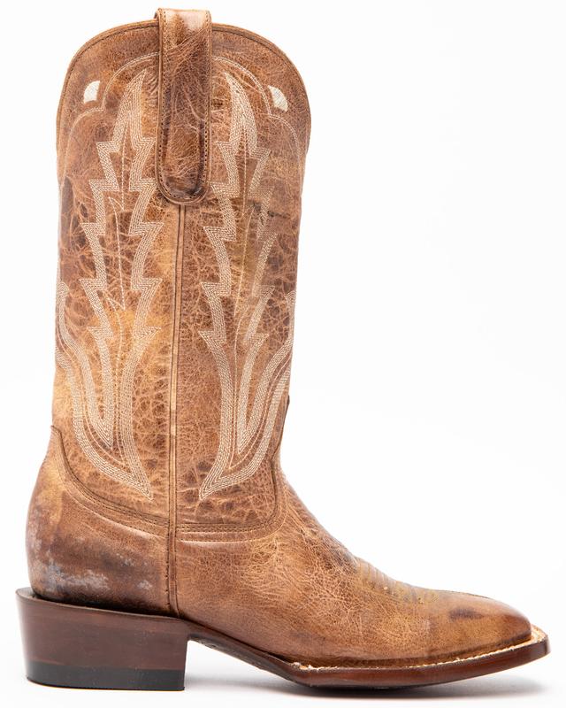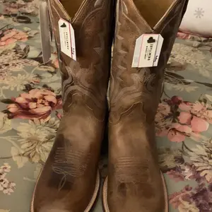 Full-grain leather upper with pigskin lining. 12" shaft height with 13.5" shaft circumference. StretchFit panels under the pull tabs give an additional inch to fit a wide range of calves. 7 mm comfort foam EVA / latex cushioned footbed. Hybrid leather TPU outsole with "Free To Roam" design. Double-stitched Goodyear welt construction. Vintage taupe with ivory western embroidery. Handcrafted by highly skilled boot artisans. 1.75" western heel. Broad square toe.