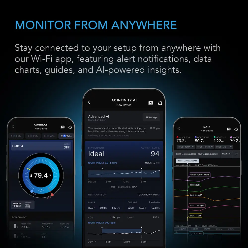 ·Precision monitoring with dual-zone temperature, humidity, and VPD tracking, plus optional CO₂, hydro, and soil sensors (sold separately) for advanced setups.