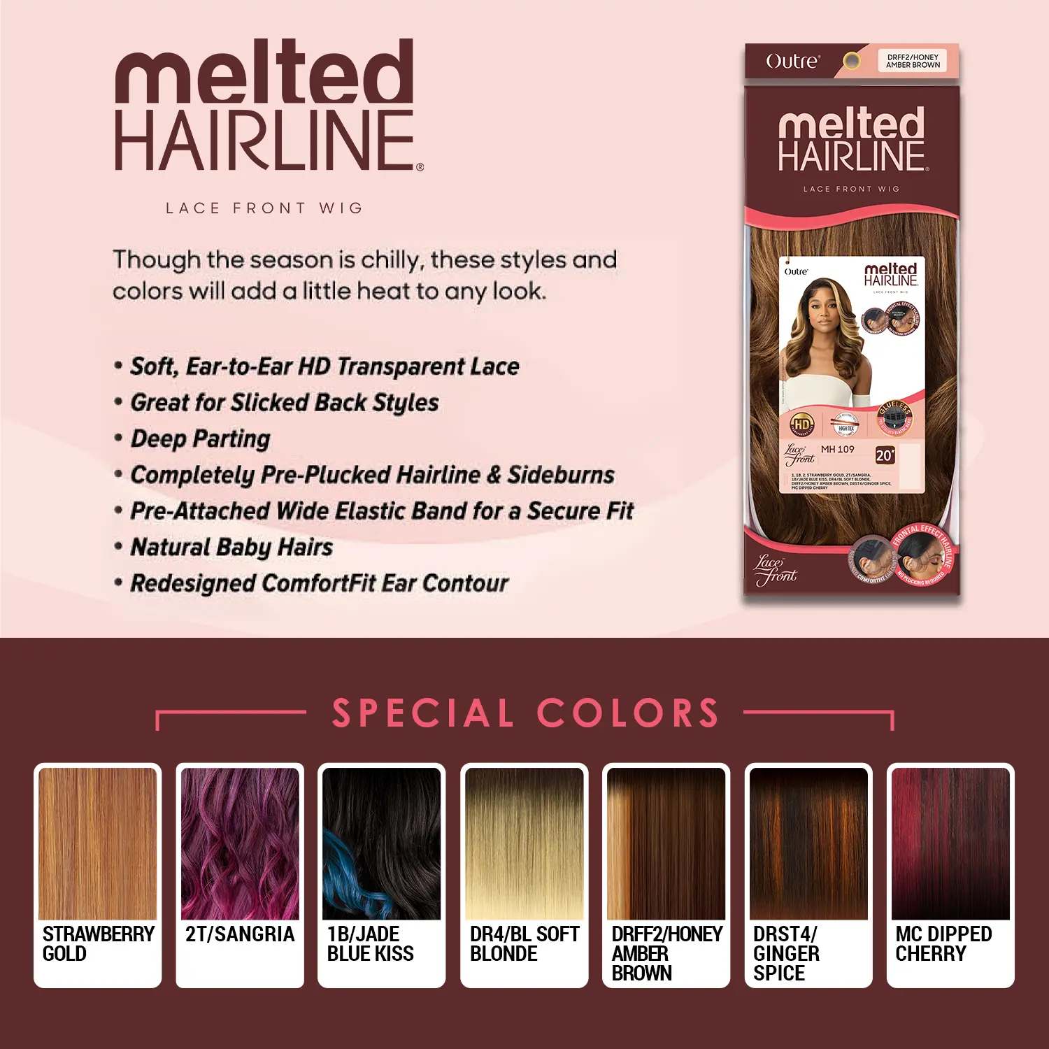 Melted Hairline has ear-to-ear soft HD Transparent Lace, a pre-attached elastic band to ensure a secure, lift-free fit, and is pre-plucked to create a natural finish that melts right onto your hairline.