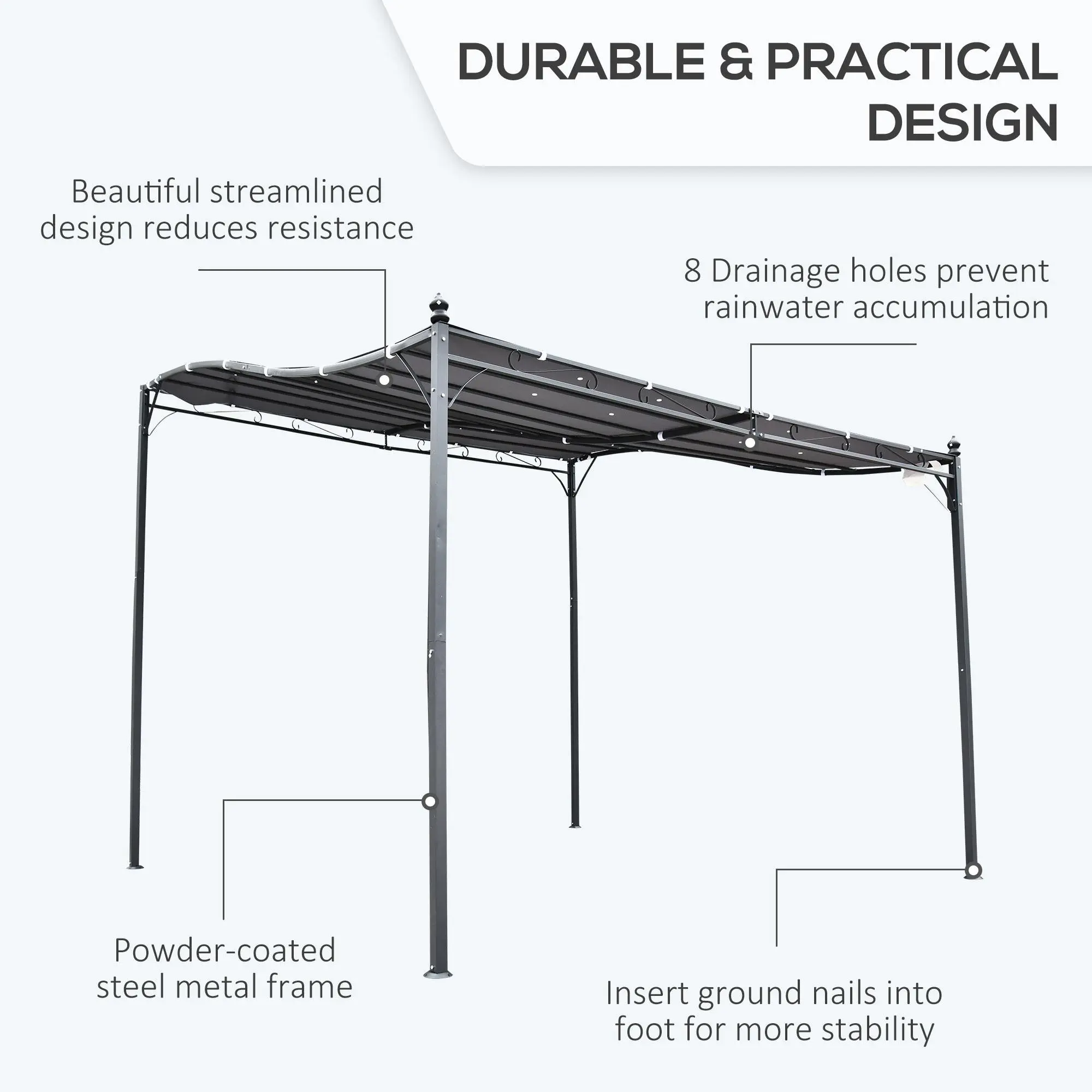 Offering subtle, stylish motifs, our European-inspired patio pergola is a practical accent. Stop sunburns and light showers. With a lean to design that neatly fits next to a door or window, our patio canopy eliminates glare and adds protection. Its powder-coated frame endures moisture without issue while offering a set of flourishes, end caps, and a curve. The fabric canopy is PA coated, so it can supply shade without the worry it will fade. Get out and get comfy with an Outsunny patio pergola