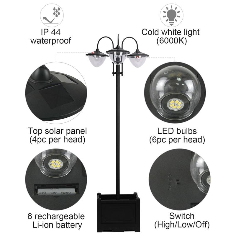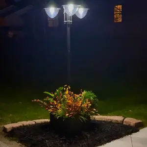 These lamps are great quality, 2 levels of brightness which is a plus. I set them up in 1 day. This includes doing the concrete and anchoring in the posts in my urn style flower pots. The pots are a hard resin. I am going to buy 2 more for the back entrance as well. Very impressed.