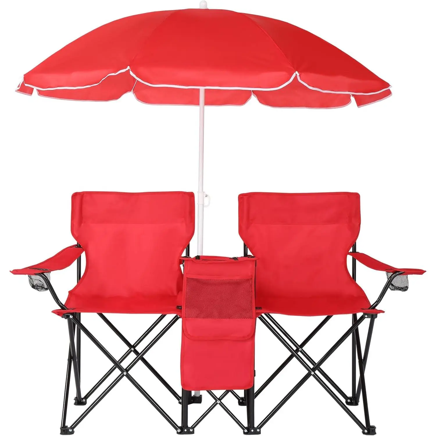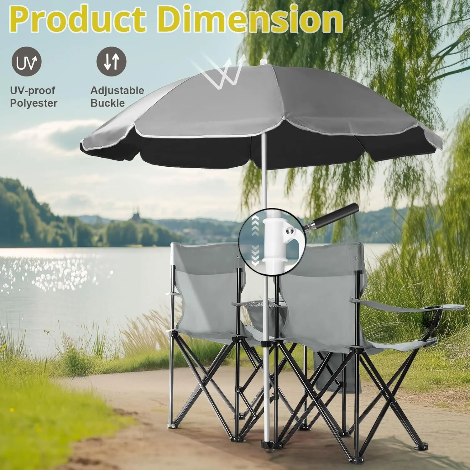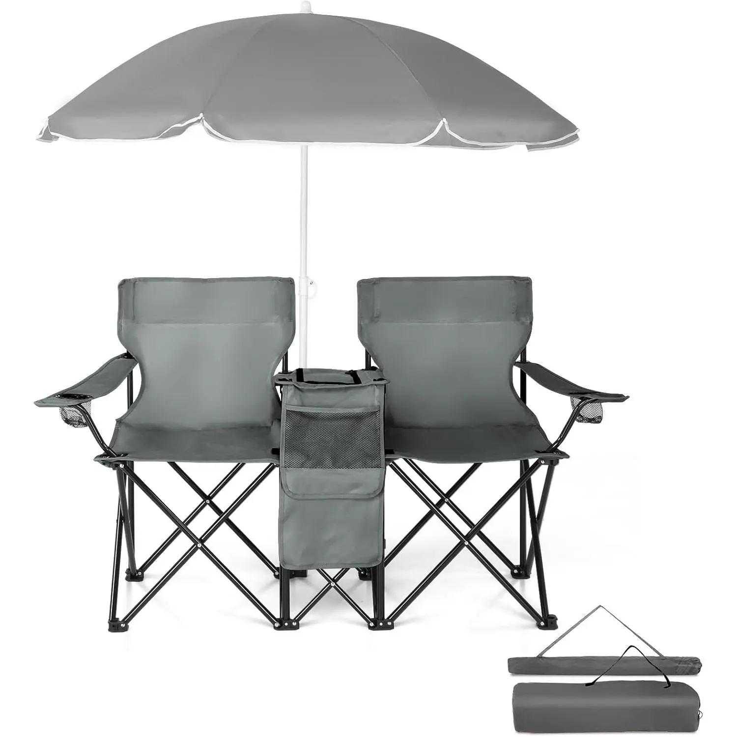 Outvita Folding Double Camping Chair w/Umbrella Beverage Holder Carrying Bag Cooler Fold Up Table, Large Bearing Capacity for Beach Patio Pool Park Outdoor Gray