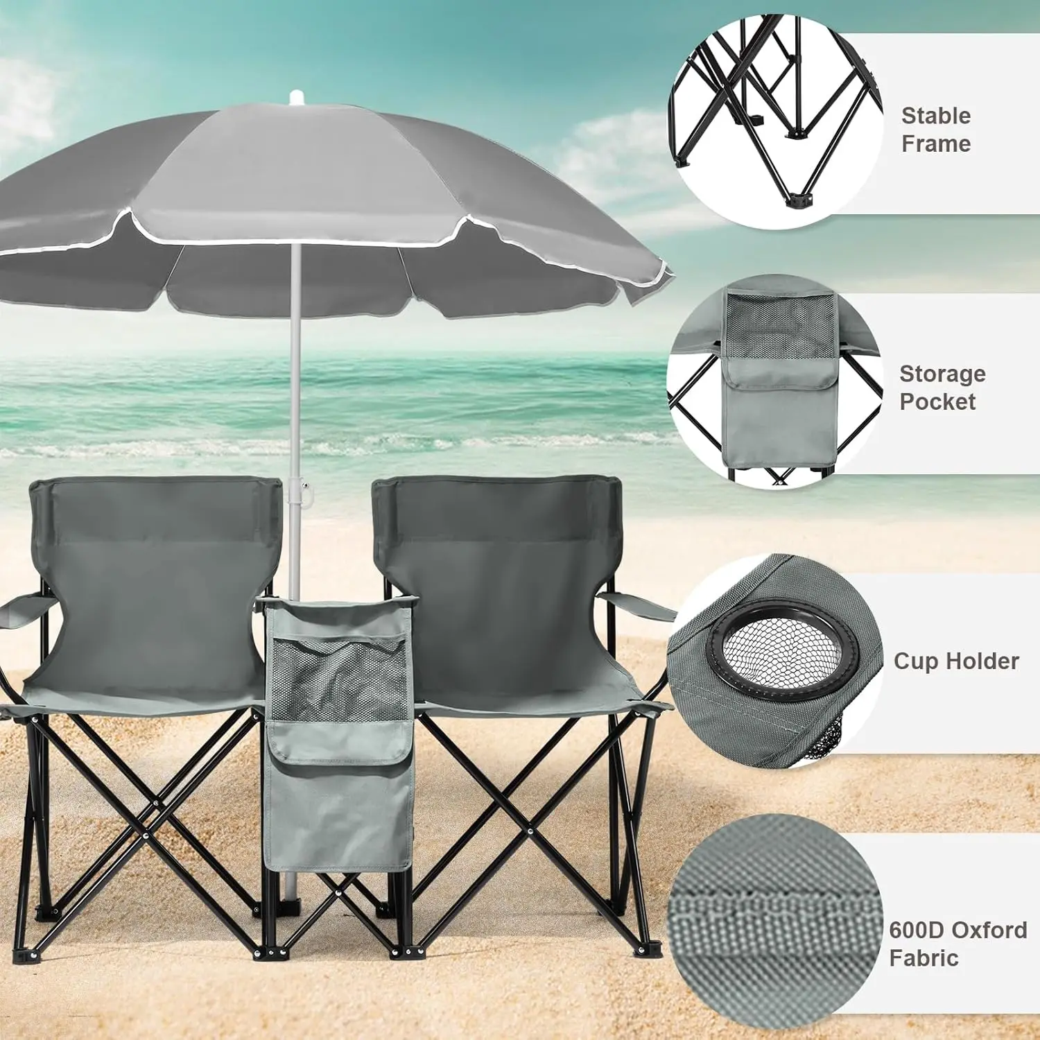 5. Outvita Folding Double Camping Chair w/Umbrella Beverage Holder Carrying Bag Cooler Fold Up Table, Large Bearing Capacity for Beach Patio Pool Park Outdoor Gray