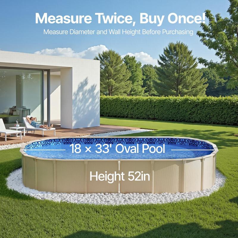 ·Fit for 18x33 ft Pools: Our pool liner is specially measured to fit 18 x 33 ft oval pools with a flat bottom and wall height of up to 52 inches, ensuring an exact and secure fit for your pool.