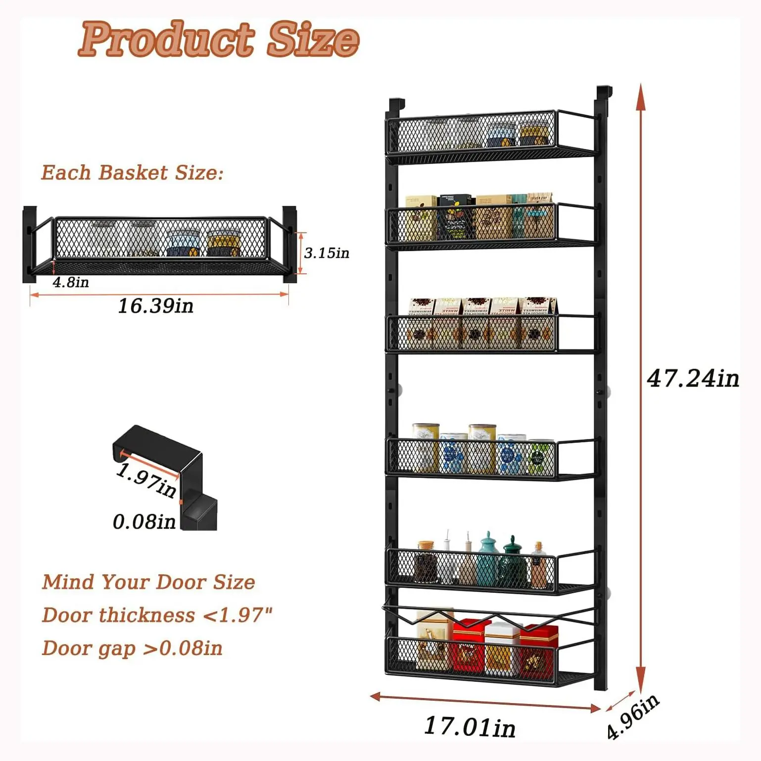 The organizer is adjustable to accommodate items of different heights. Easily nail it to your wall or door for a secure fit. It includes 4 adhesive stickers to prevent swinging when opening and closing doors. The full basket design ensures your items won't slide off. Keep your space organized effortlessly!