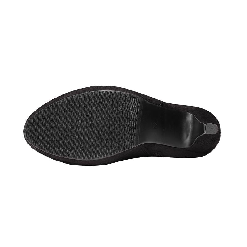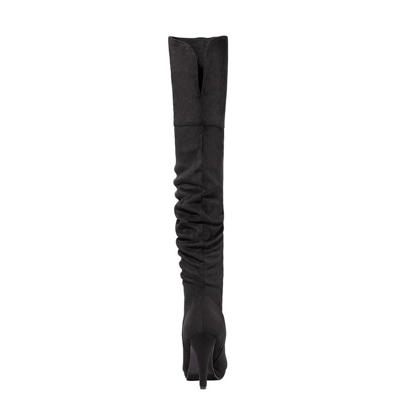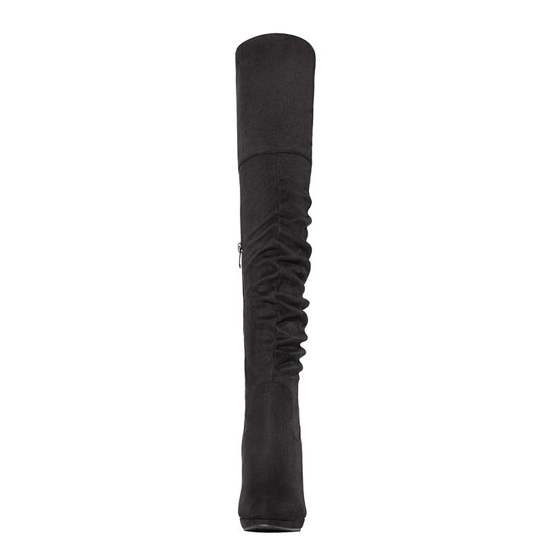 ·These over-the-knee-high chunky heel boots feature stretch suede upper and a round toe