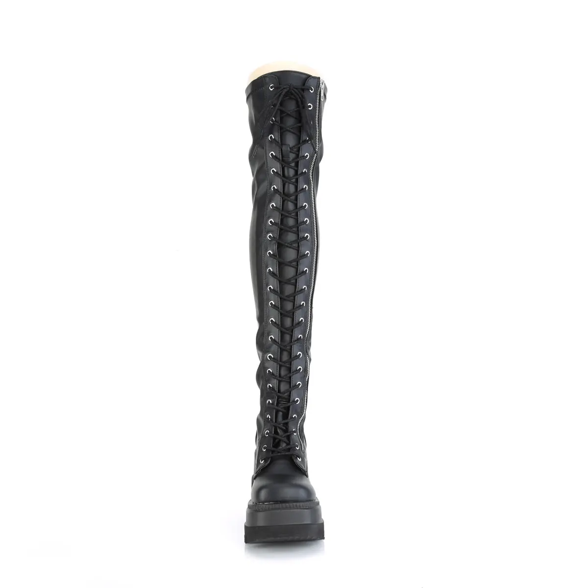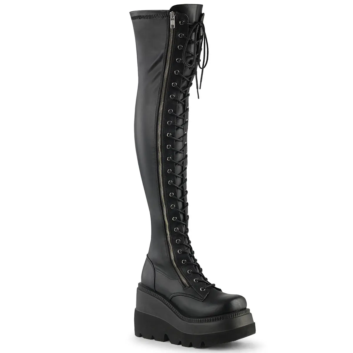 Unleash your inner rebel with our striking Shaker-374 thigh-high boots. Designed with a 4 1/2" wedge platform, lace-up front, and black stretch vegan leather material, these boots are perfect for anyone looking for comfort and style. The full-length outside metal zipper ensures easy on and off, allowing you to step out in style with ease. Whether you're looking to spice up your everyday wear or make a statement at your next concert or cosplay event, the Shaker-374 is sure to turn heads. Don't wait any longer, add these iconic boots to your ensemble today and elevate your style to the next level.