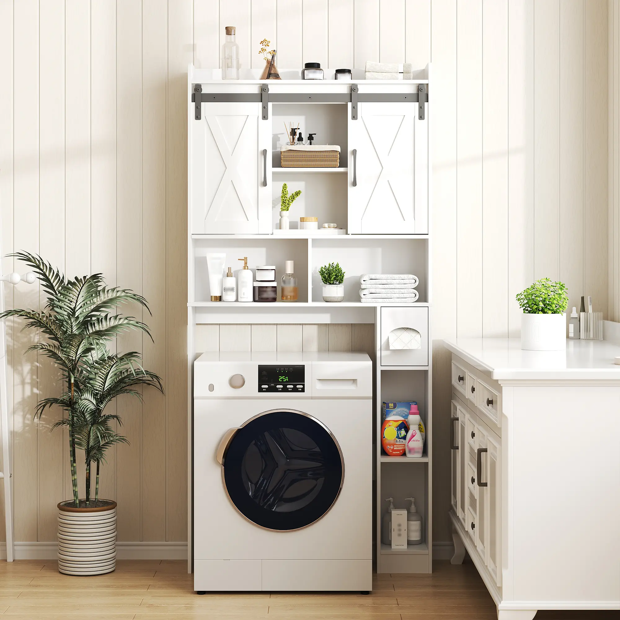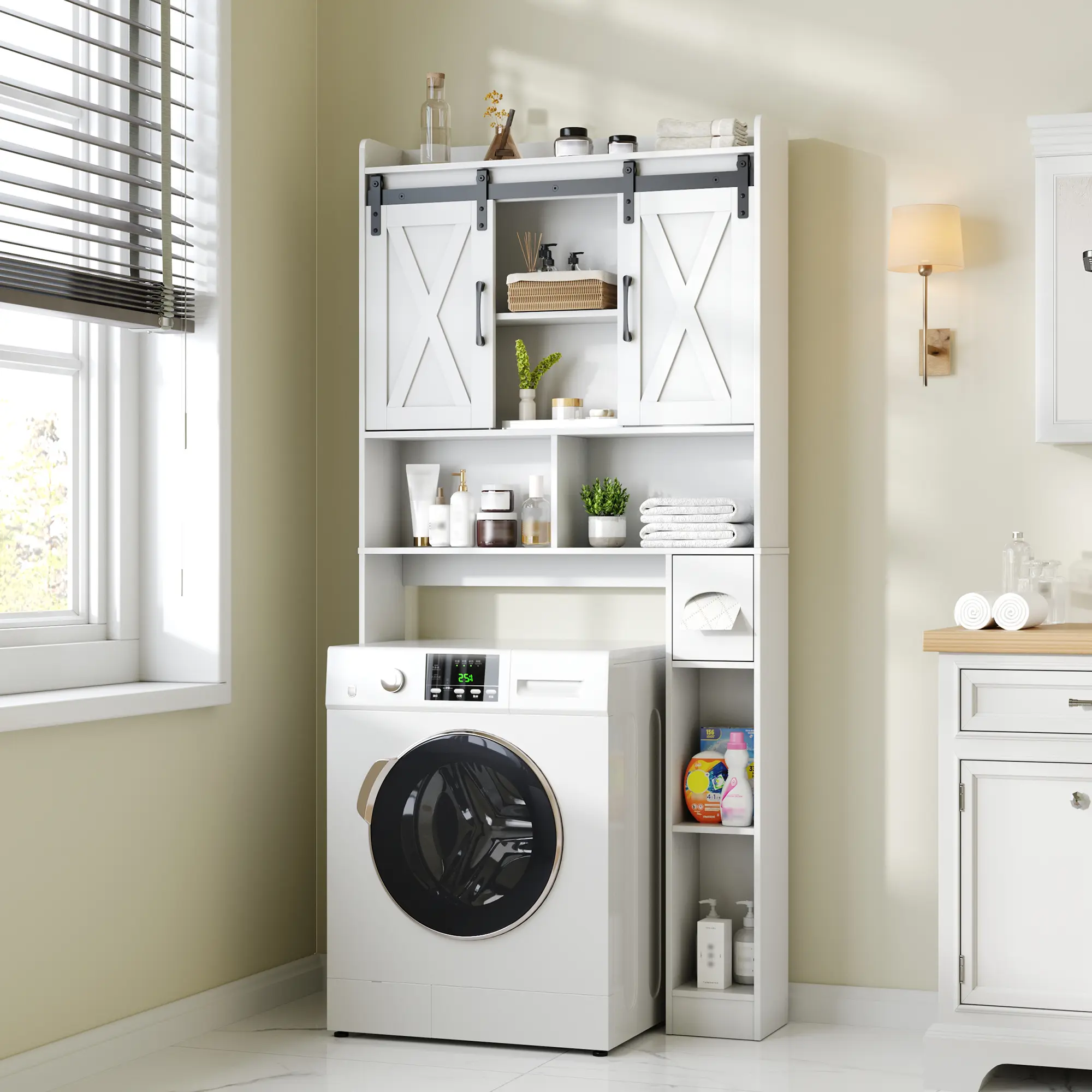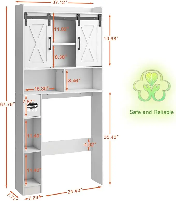 ·【Bathroom Organizer Size】Measuring 67" x 32" x 7.7", this over-the-toilet storage cabinet offers an efficient storage solution without occupying excessive space in your bathroom. Prior to purchase, please ensure the dimensions meet your requirements.