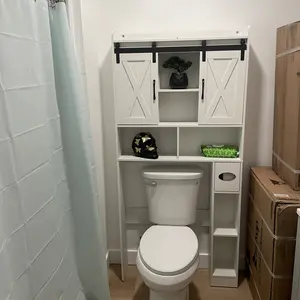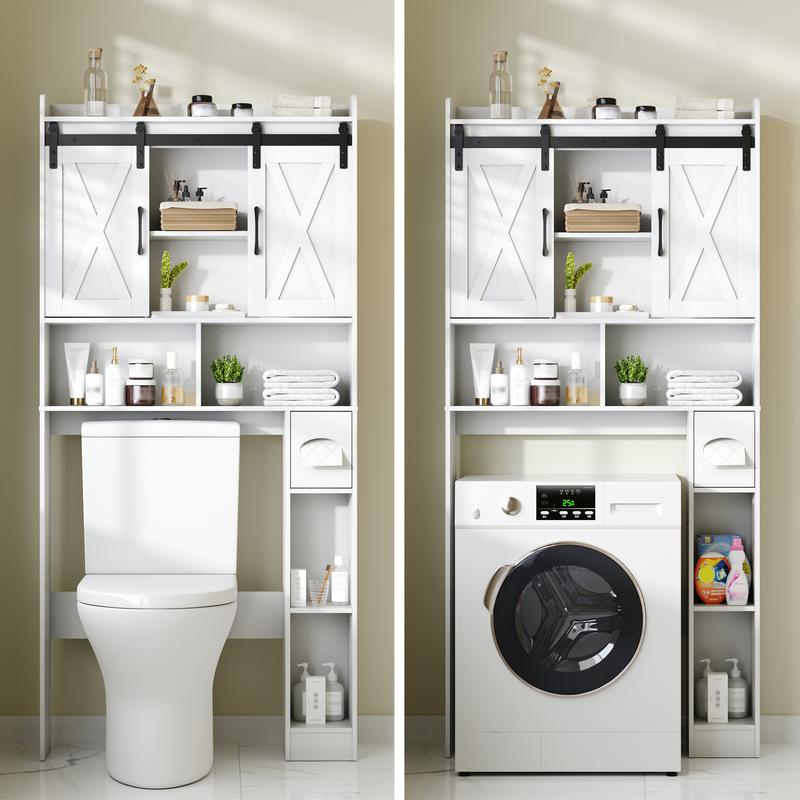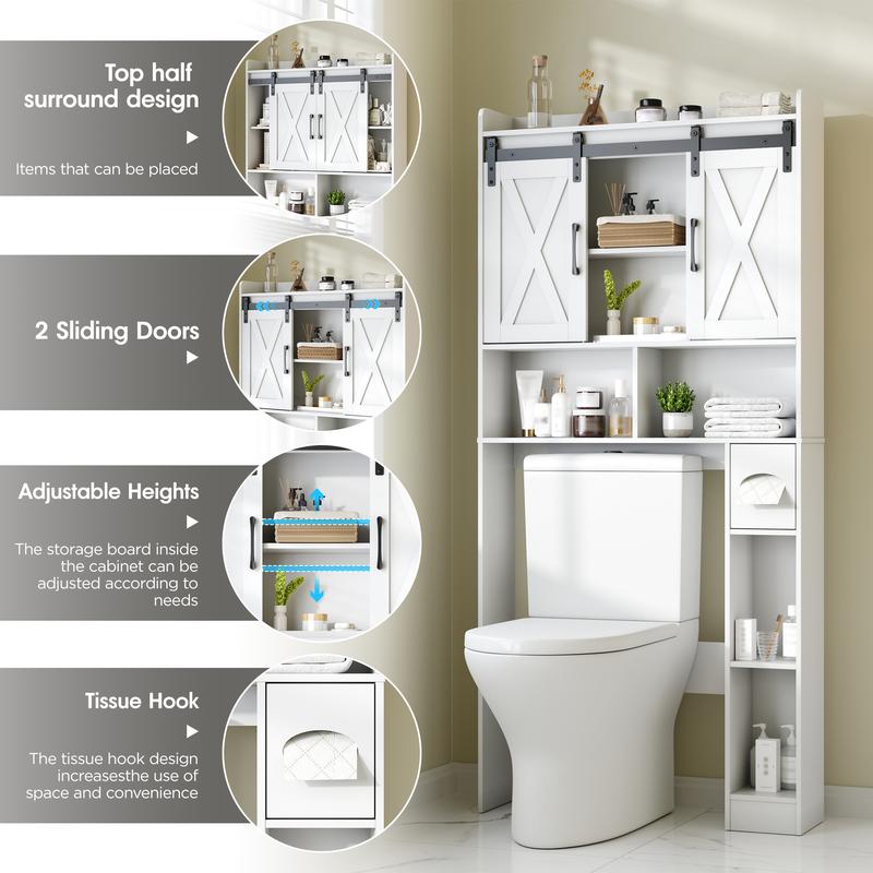 【Multi-functional Unique Design】Featuring 2 sliding doors for discreetly storing towels and toilet paper, this over-the-toilet rack shelf also includes open shelves for convenient access to everyday essentials. Specially designed vertical cabinets offer additional storage space for paper rolls, ensuring your bathroom stays organized and clutter-free.