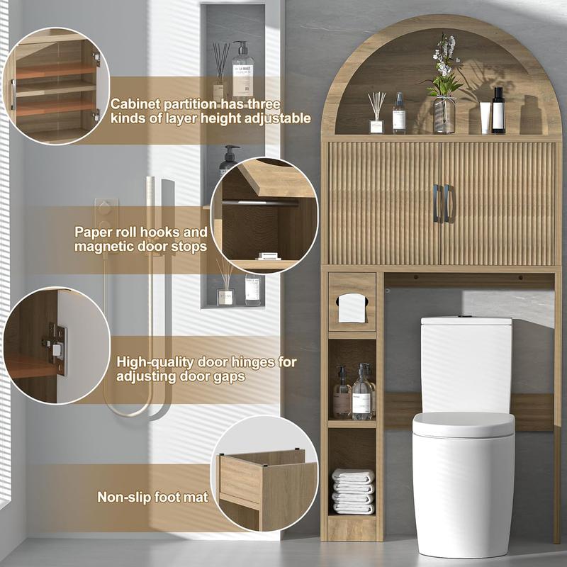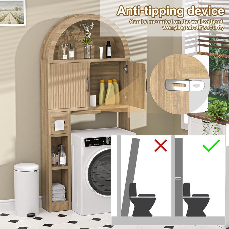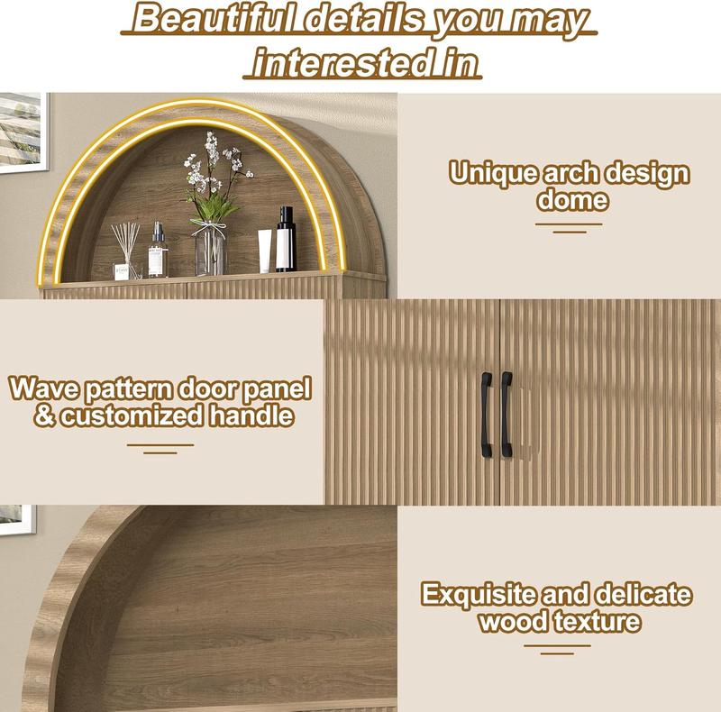 ·ELEGANT DESIGN DETAILS: The Arched Cabinet with Wave Patterned Doors add a touch of elegance to your bathroom decor. The Magnetic Door Catch and Non-Slip Pads are thoughtful details that not only enhance functionality but also add to the overall safety of the unit.