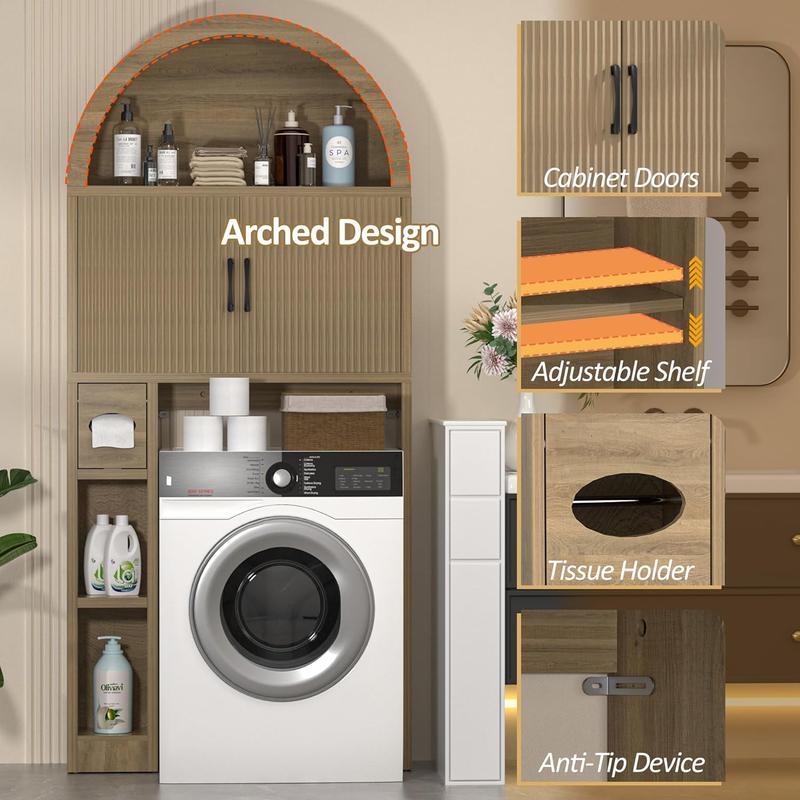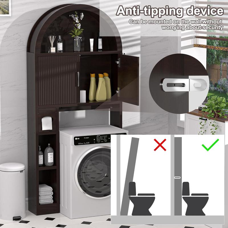 ·Over the Toilet Storage with Arched Design: Our over the toilet storage cabinet has a unique elegant arched top design, which makes our cabinet provide more storage space than others. The overall dimensions: 30.5”W x 7.7”D x 67.7”H & 23.7"L * 7.7"W * 69"H, which is suitable for most standard height toilets and some small washing machines.