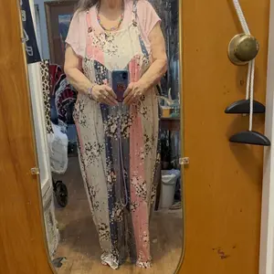 Beautiful multicolored floral print overalls, soft knit fabric. I previously bought 3 different sets but with over 60 pounds weight loss too big bought 3 more downsized to 1X, smallest size, could have down sized more. I love these.